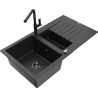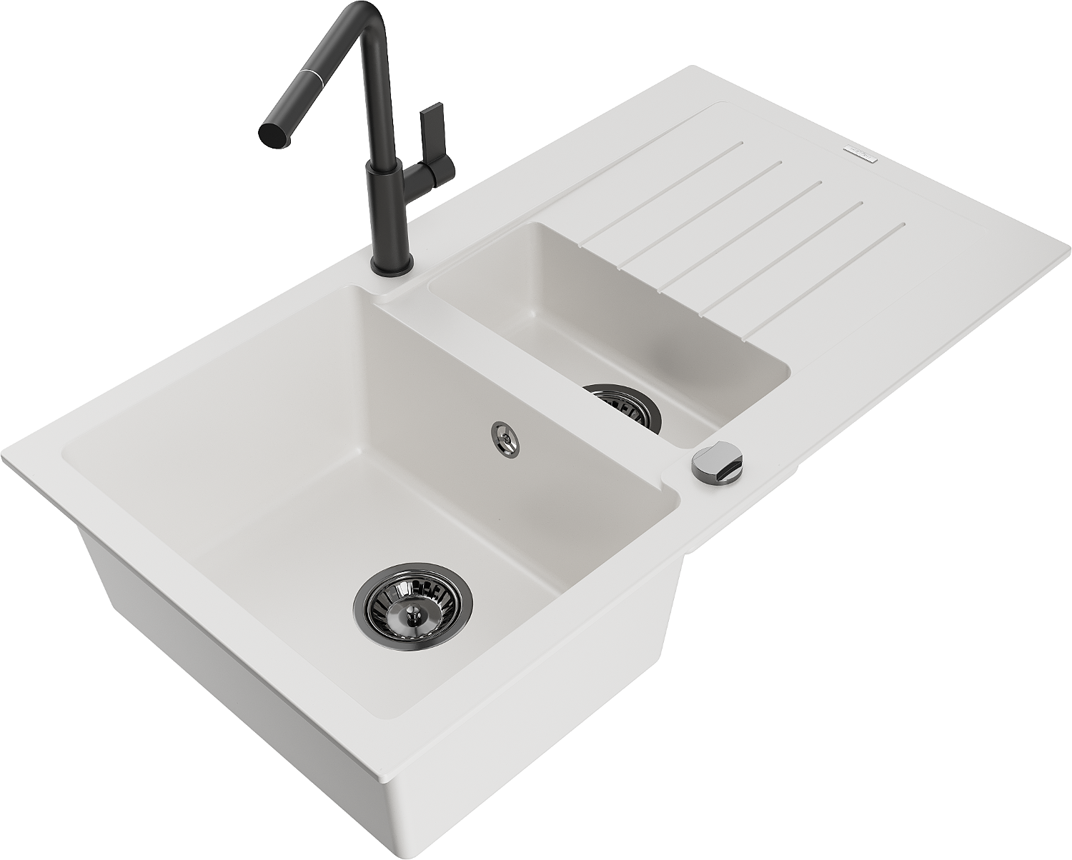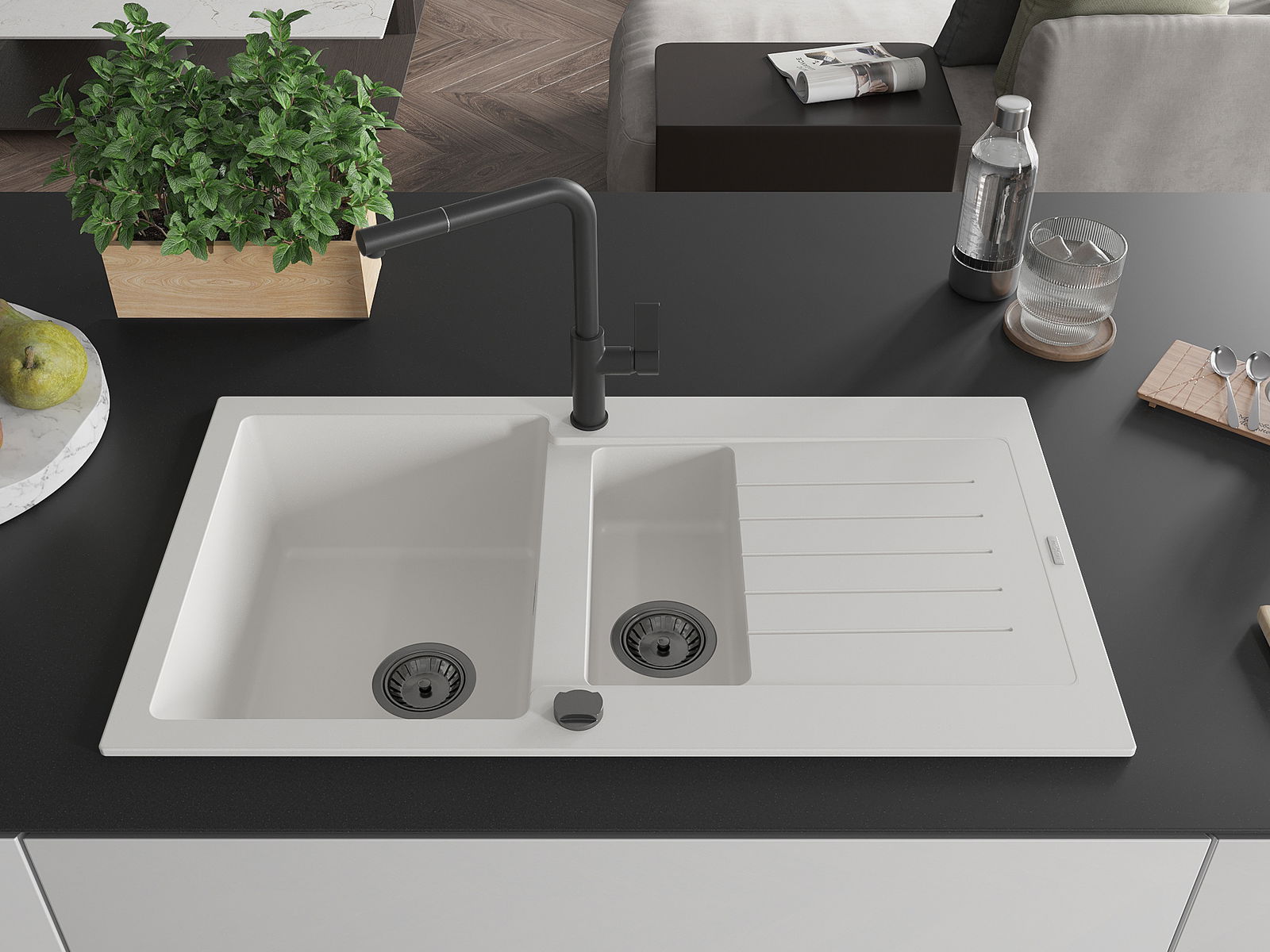 Mexen Matias žulový dřez 1,5-komorový s odkapávačem a kuchyňskou baterií Flora, bílý - 6502-20-670401-70-B
