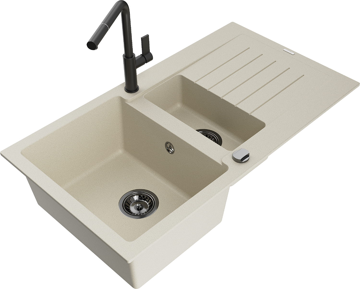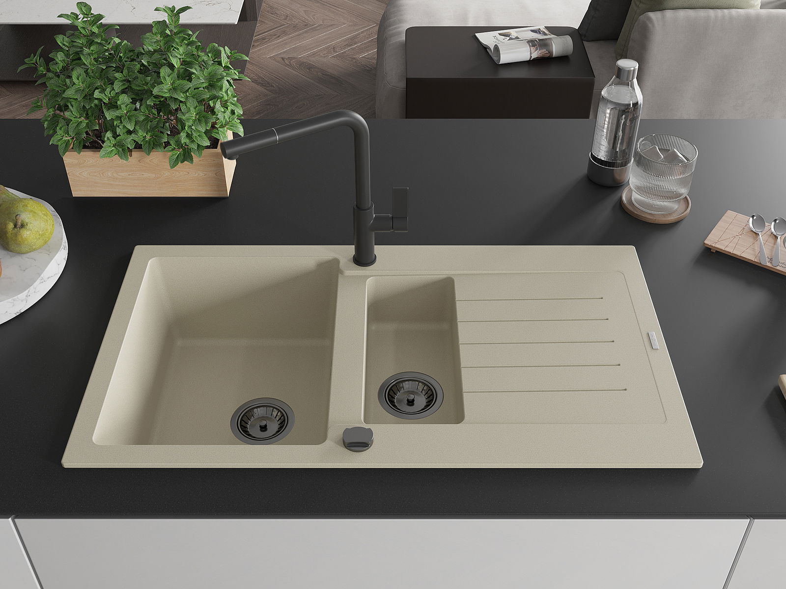 Mexen Matias žulový dřez 1,5 komorový s odkapávačem a kuchyňskou baterií Flora, béžový - 6502-69-670401-70-B