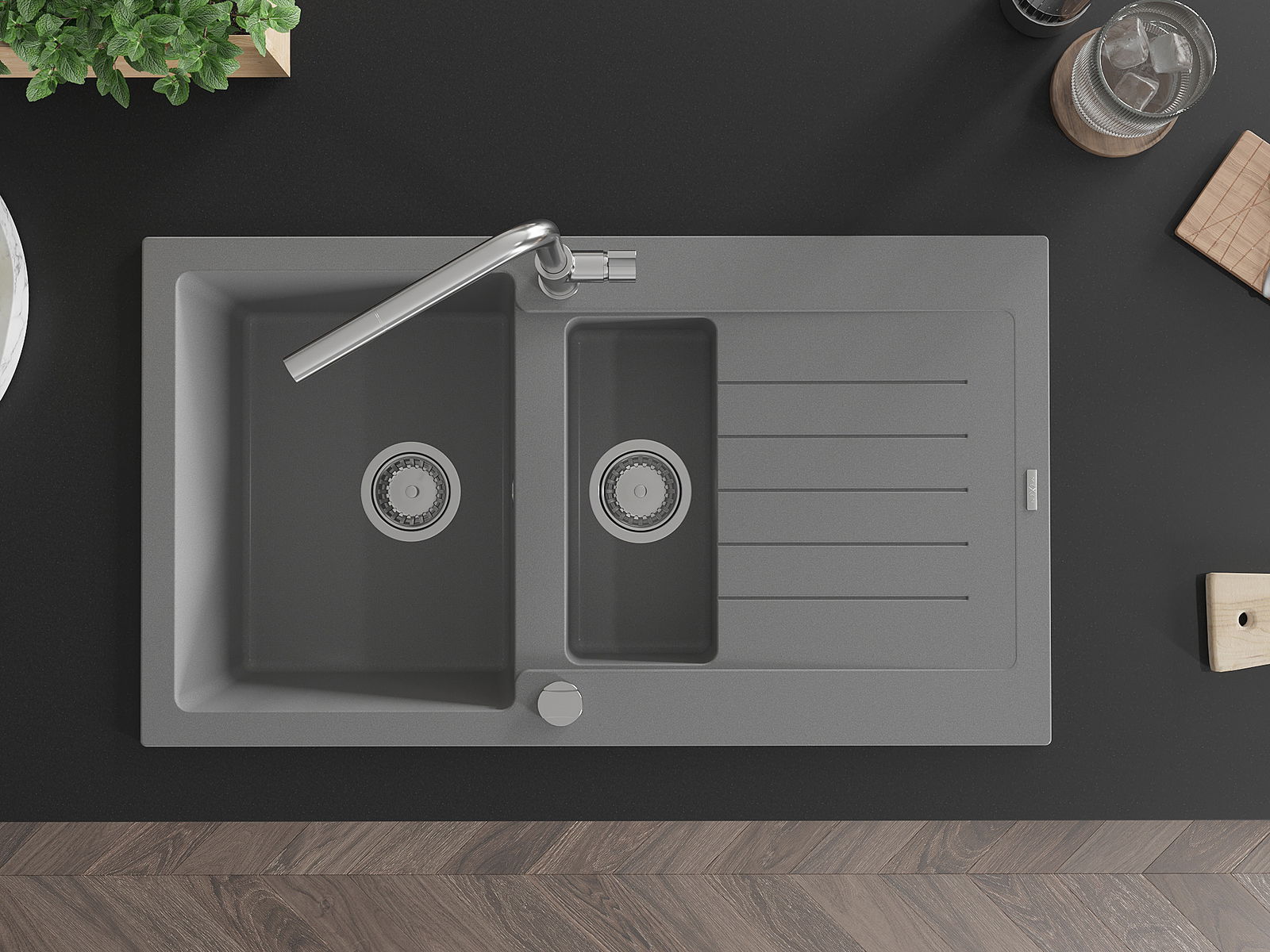 Mexen Matias granitový dřez 1,5-komorový s odkapávačem a kuchyňskou baterií Flora, šedý - 6502-71-670401-00
