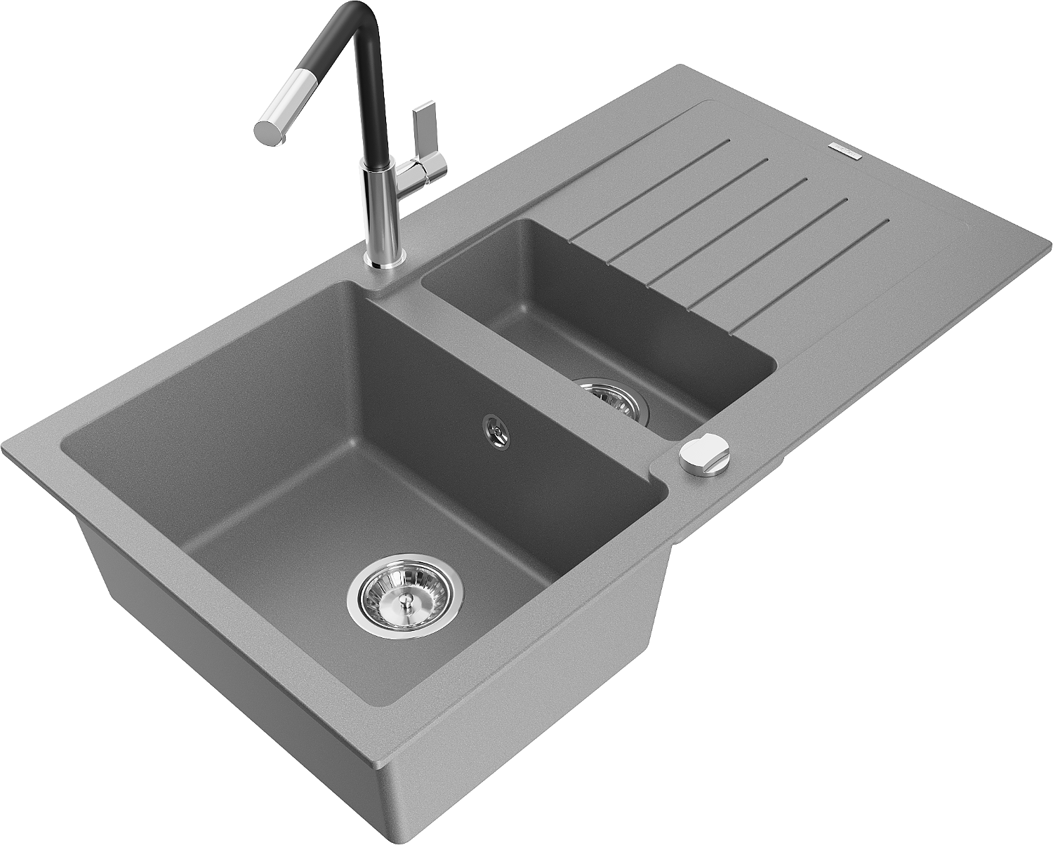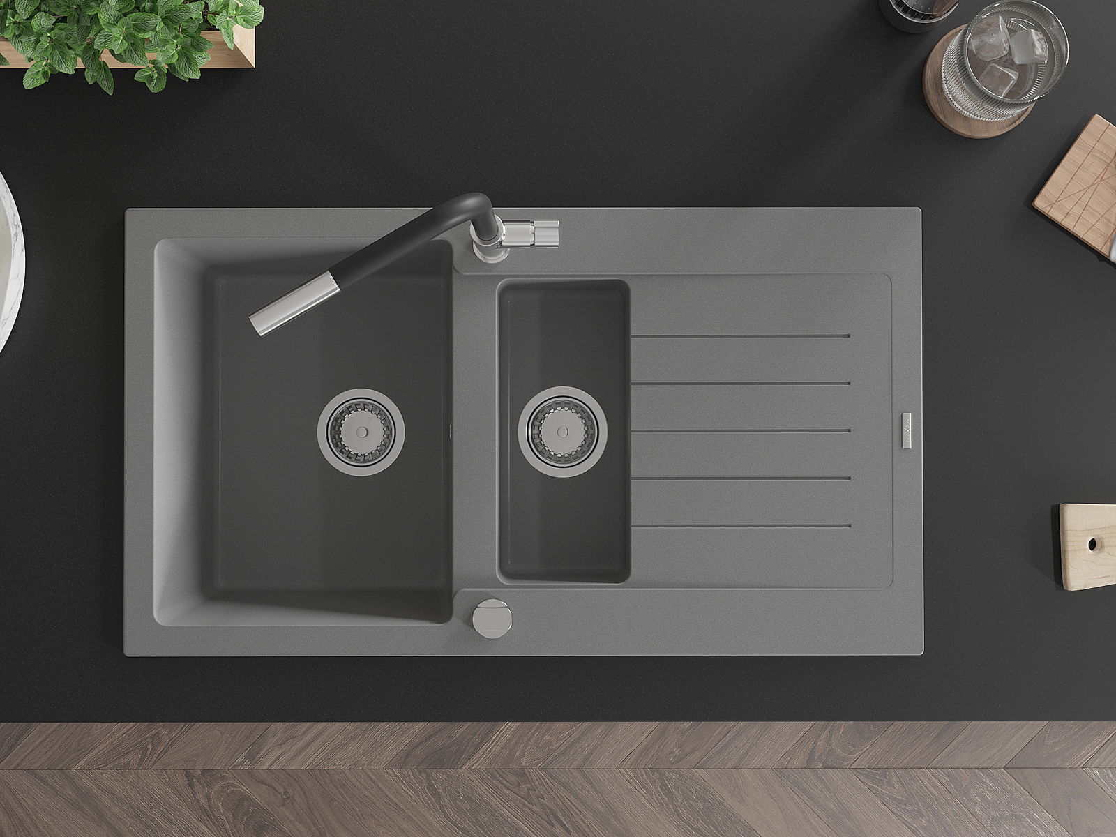 Mexen Matias granitový dřez 1,5-komorový s odkapávačem a kuchyňskou baterií Flora, šedý - 6502-71-670401-07