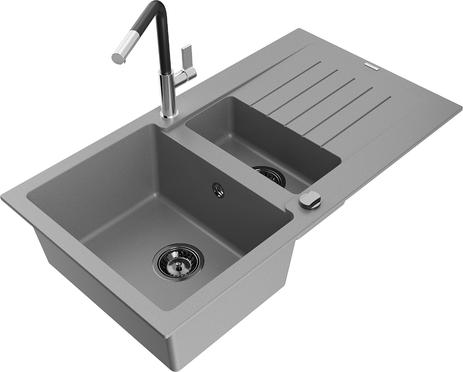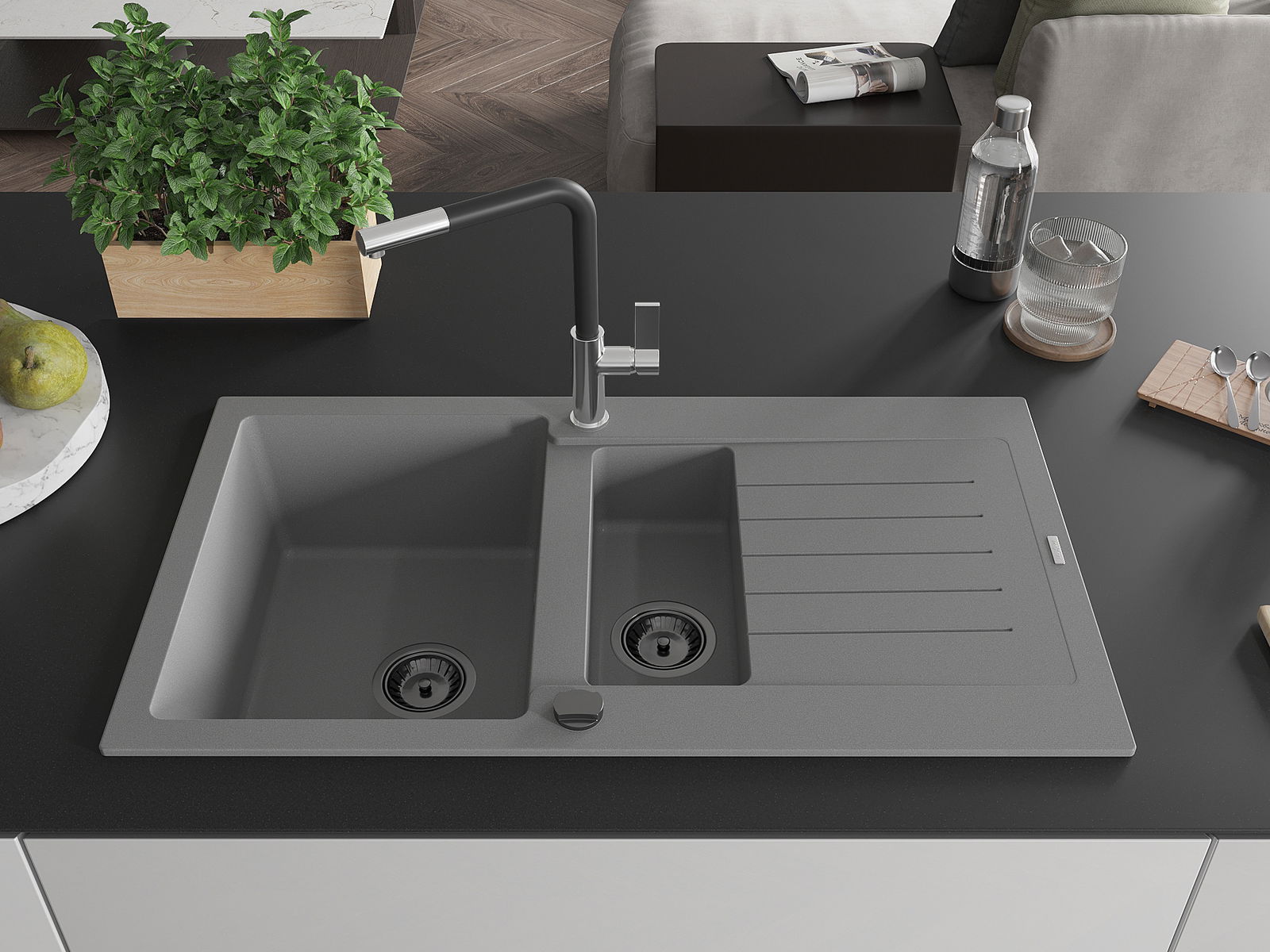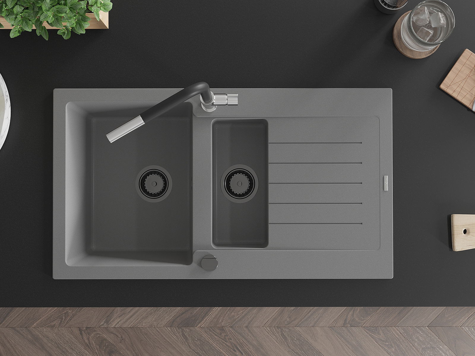 Mexen Matias granitový dřez 1,5-komorový s odkapávačem a kuchyňskou baterií Flora, šedý - 6502-71-670401-07-B
