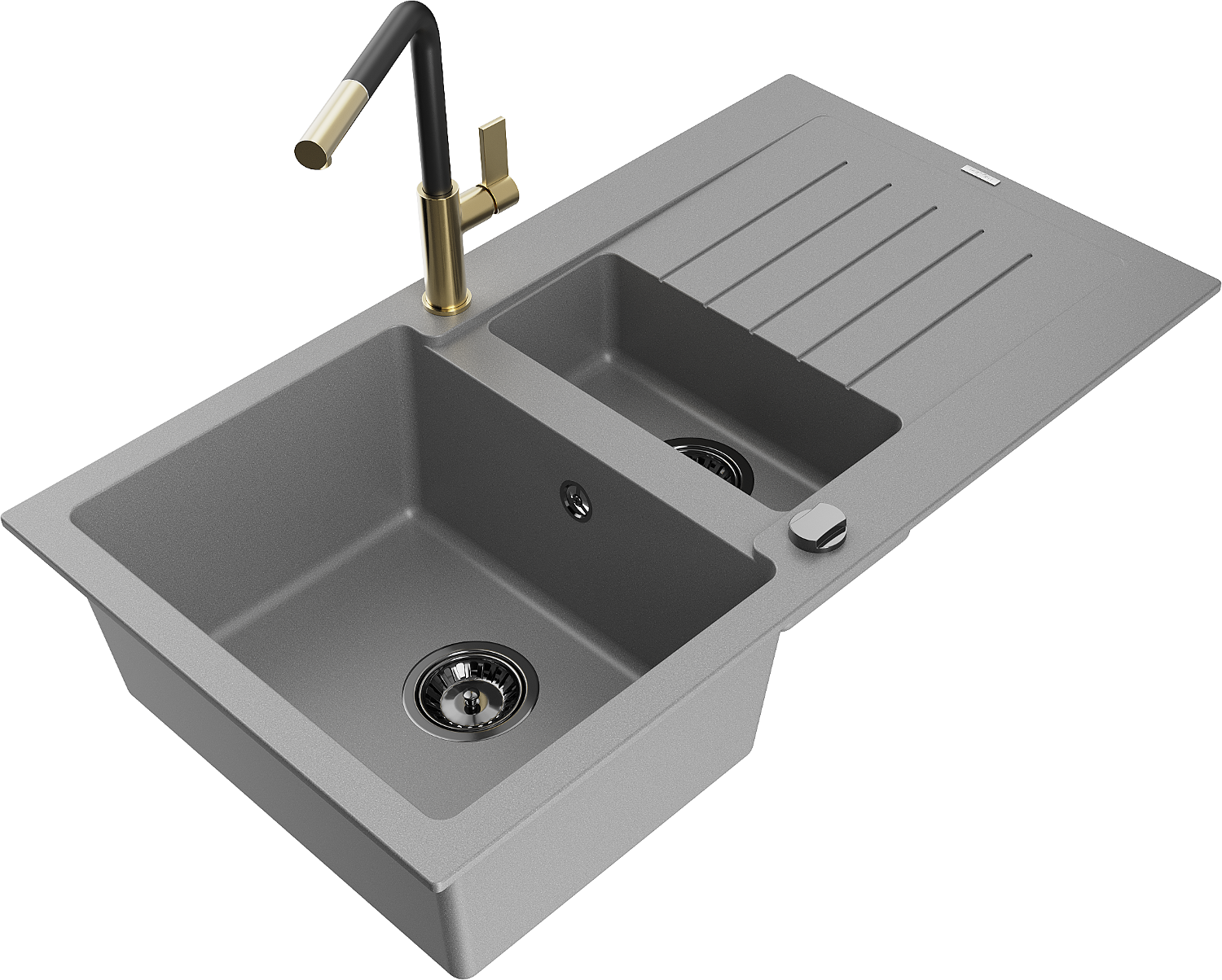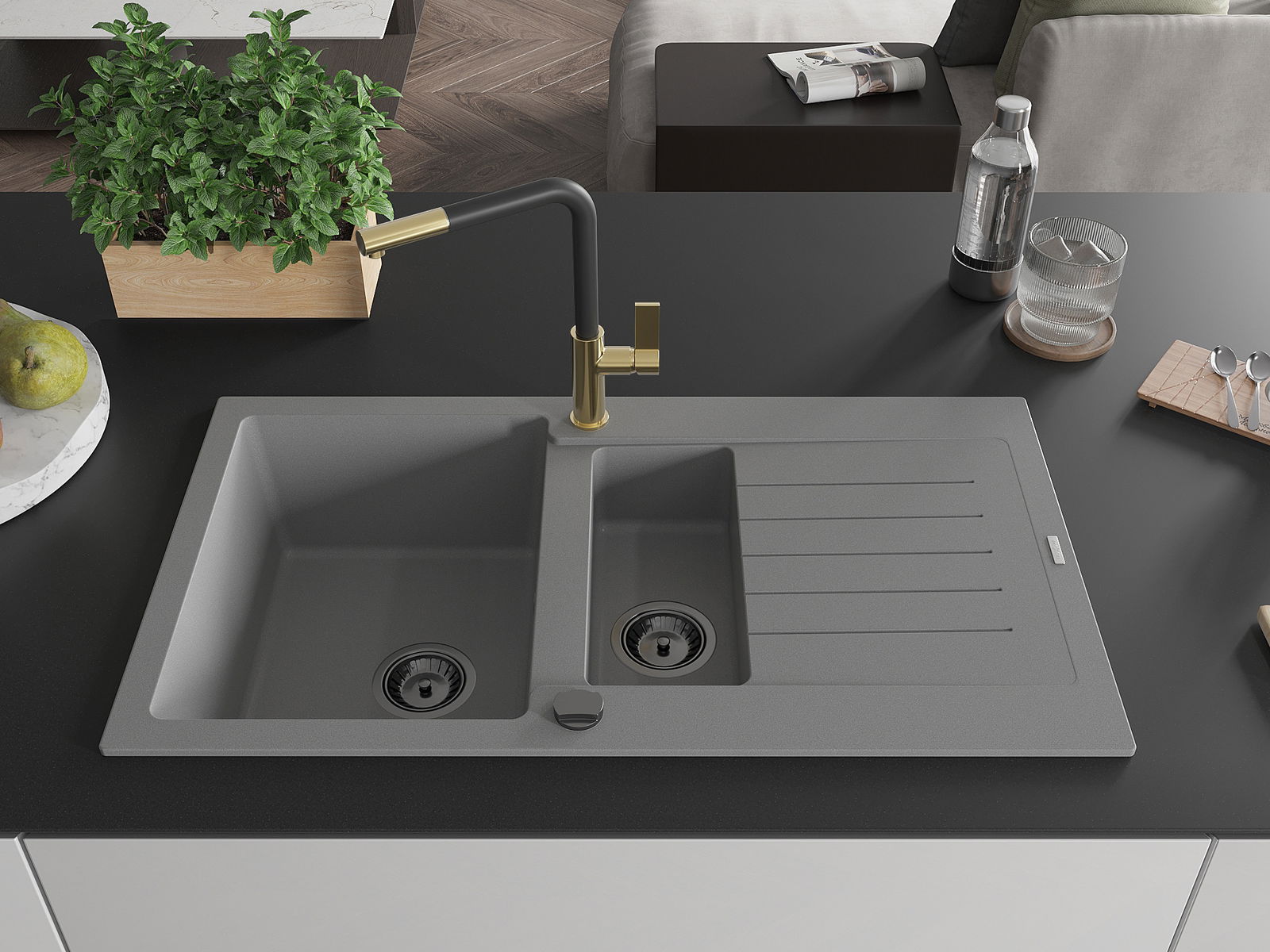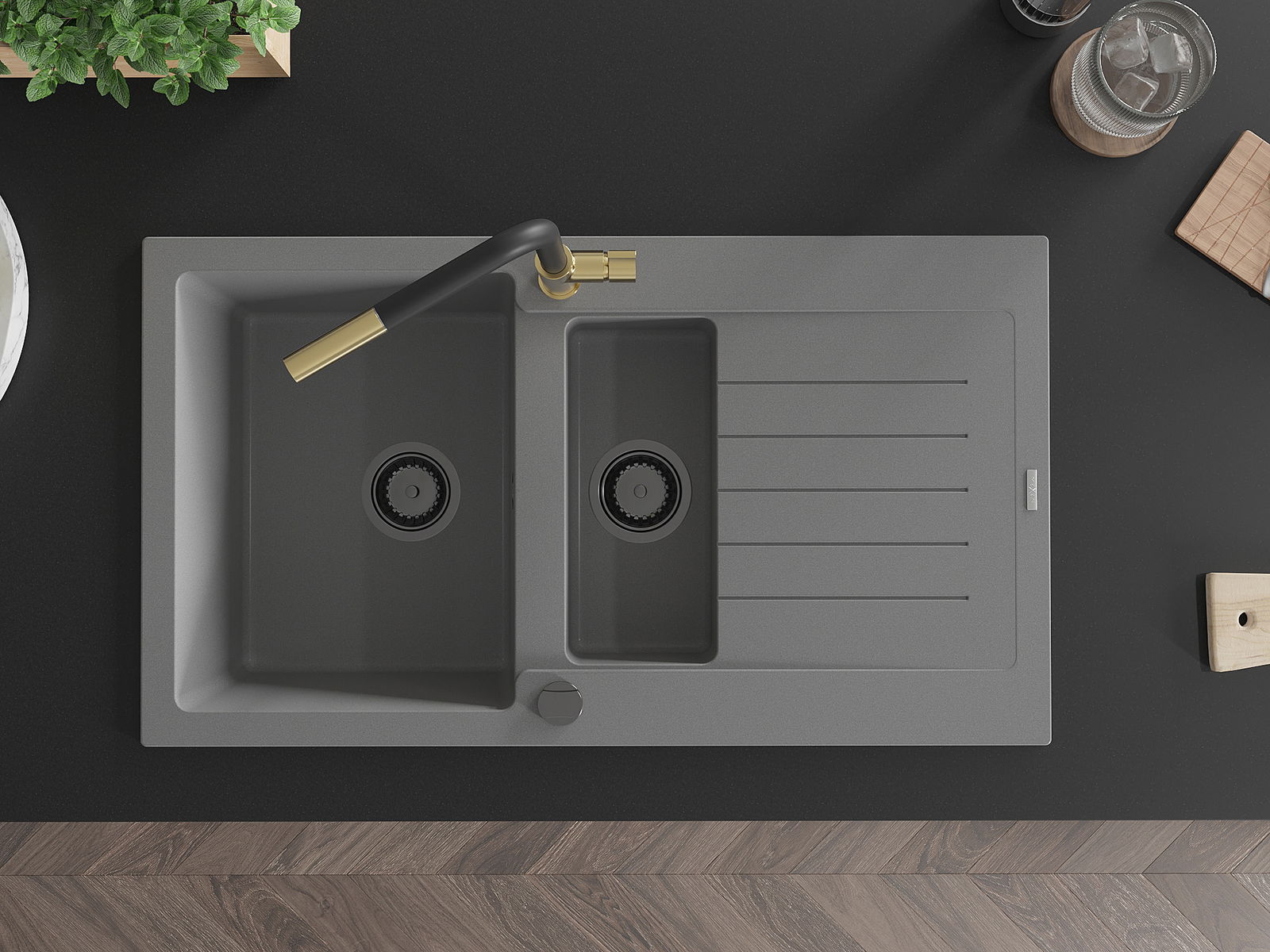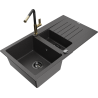 Mexen Matias dřez z umělého kamene 1,5-komorový s odkapávačem a kuchyňskou baterií Flora, šedý - 6502-71-670401-57-B