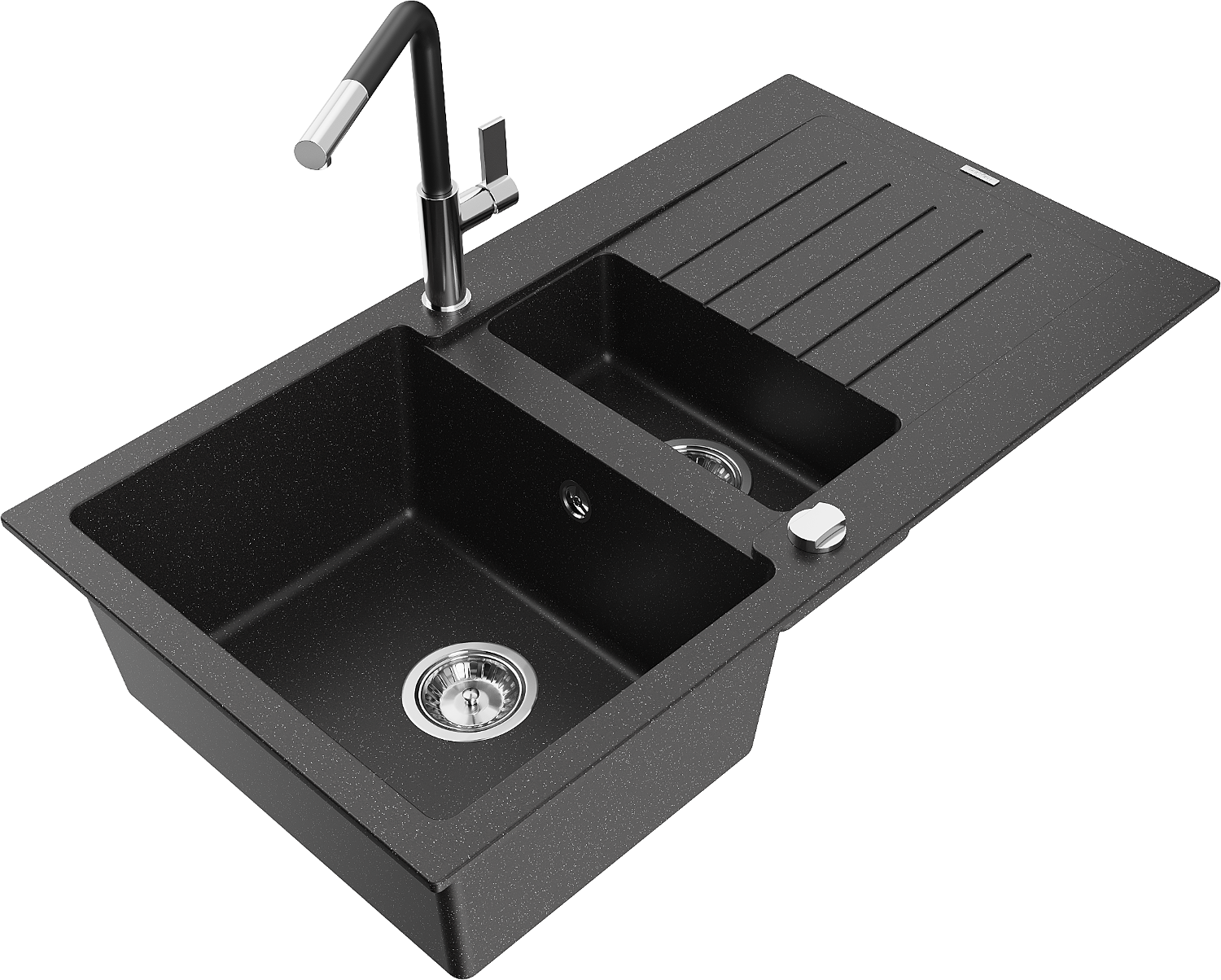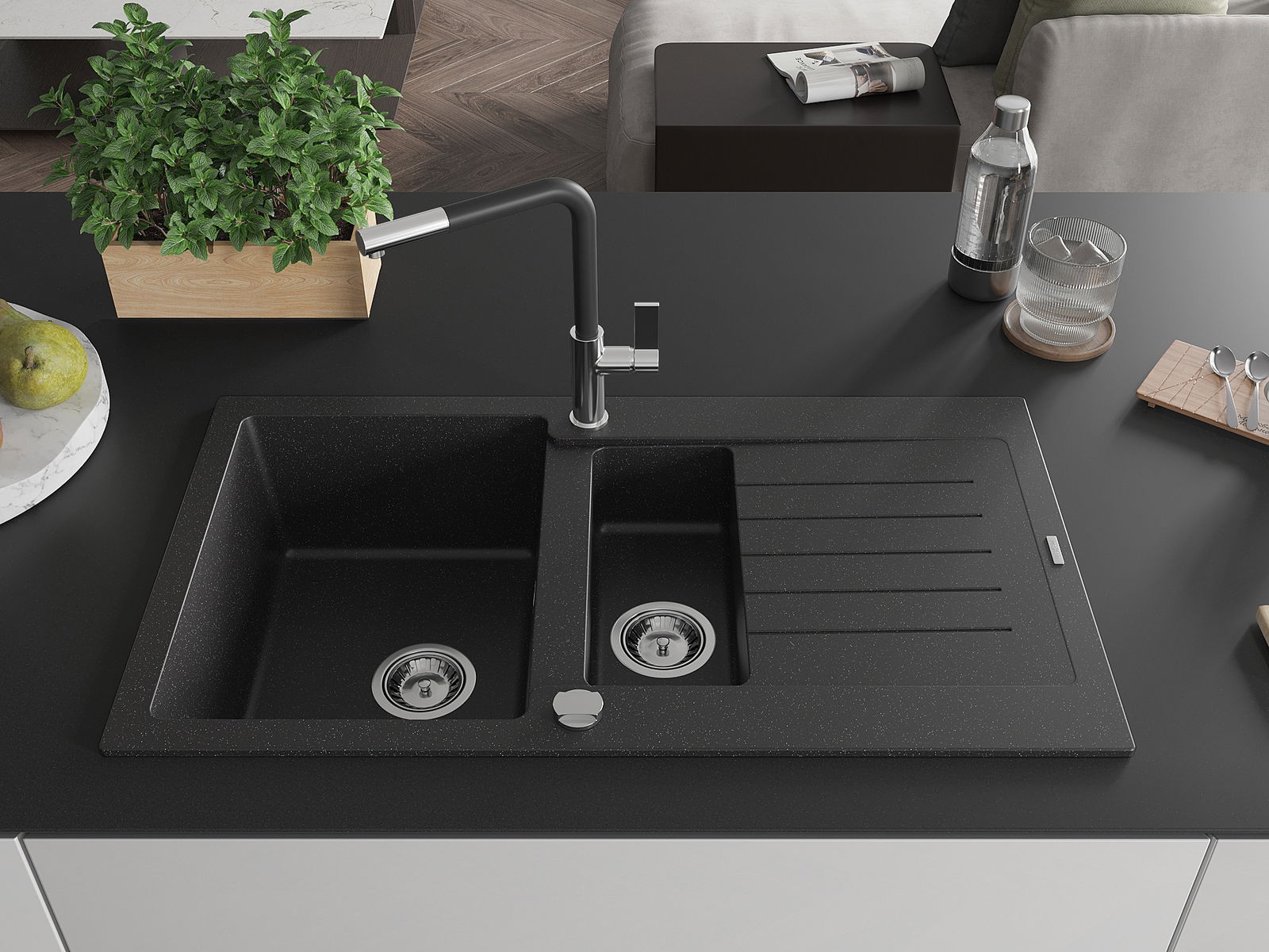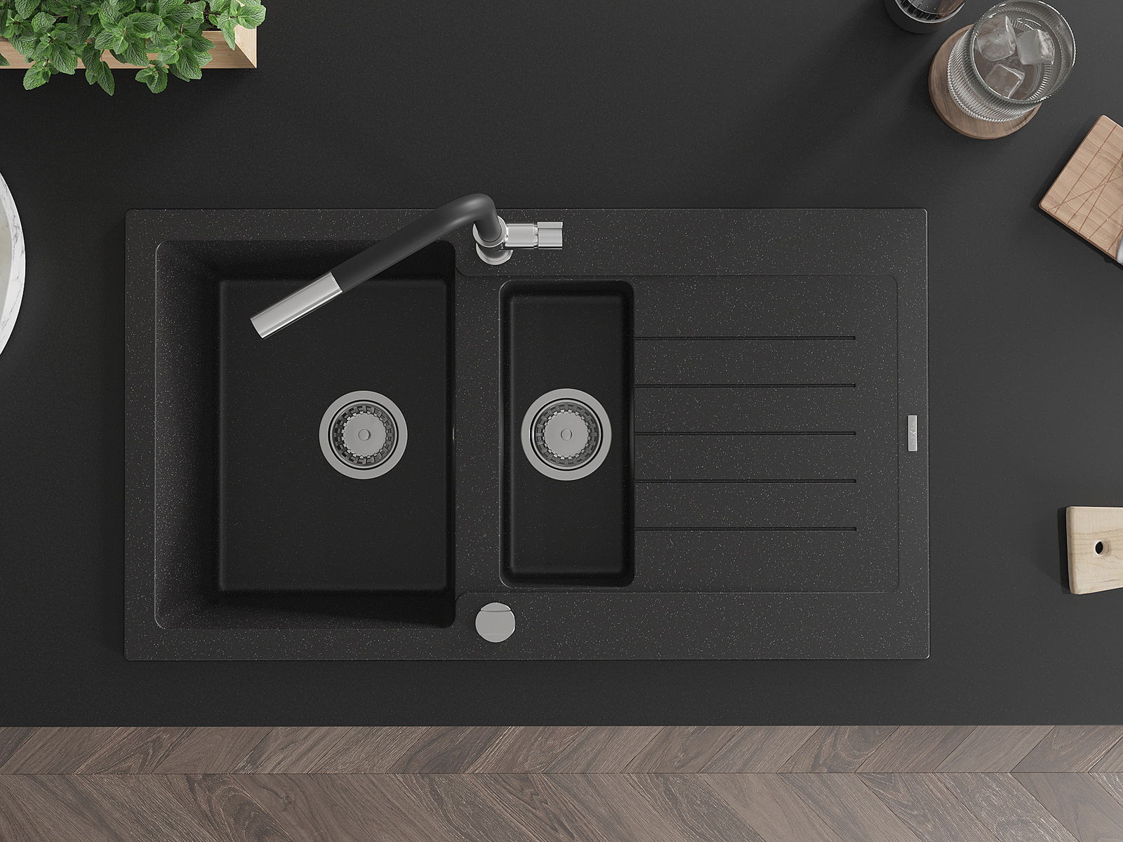 Mexen Matias žulový dřez 1,5-komorový s odkapávačem a kuchyňskou baterií Flora, černý/stříbrný - 6502-73-670401-07