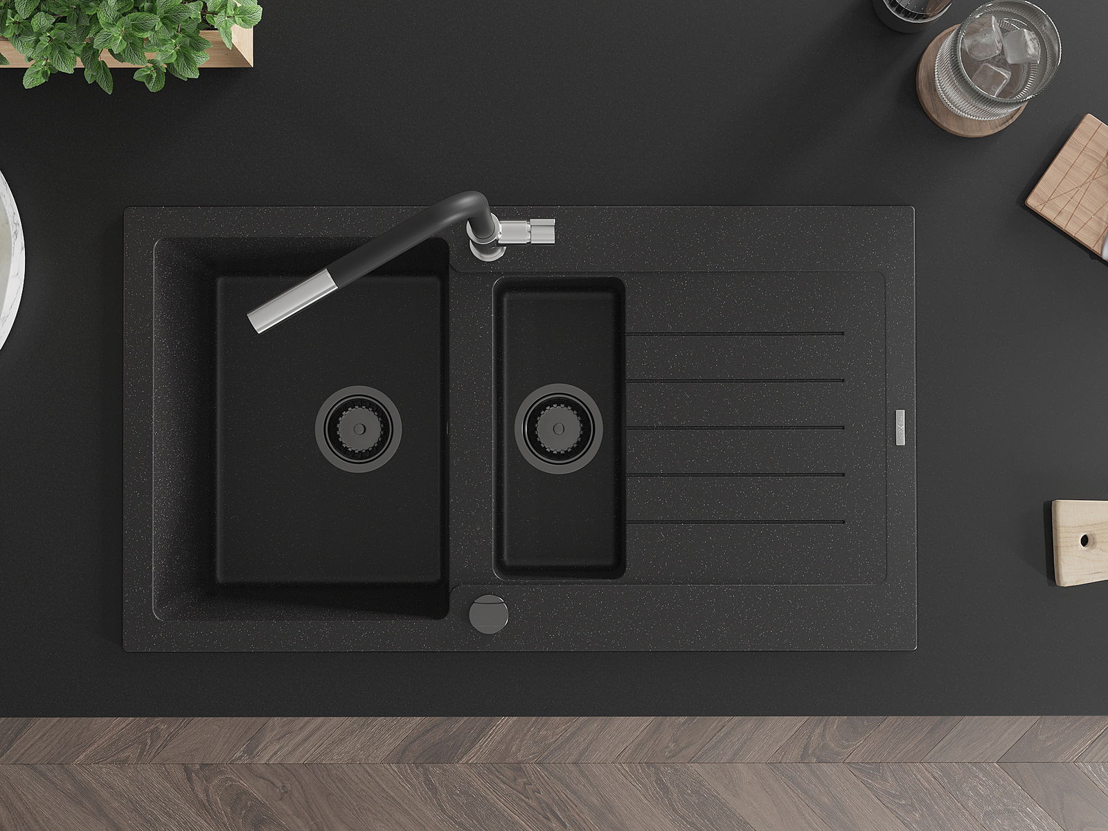 Mexen Matias granitový dřez 1,5-komorový s odkapávačem a kuchyňskou baterií Flora, černý/stříbrný - 6502-73-670401-07-B