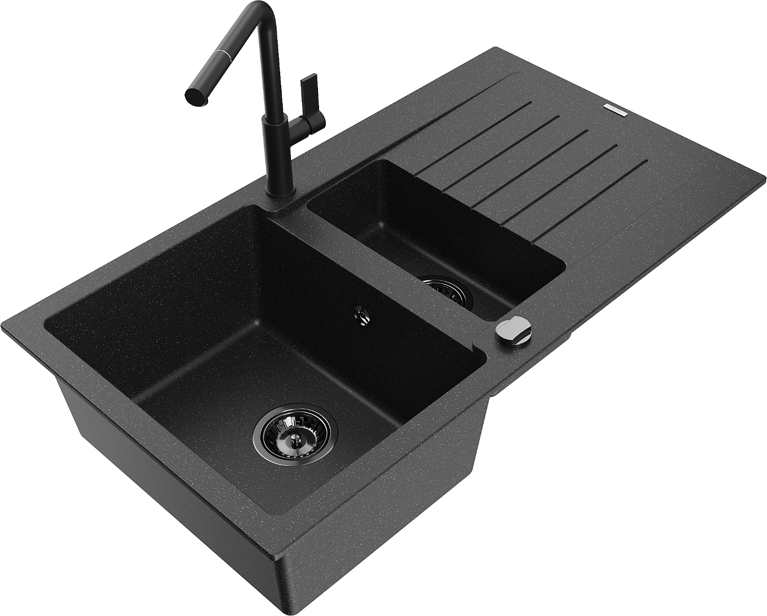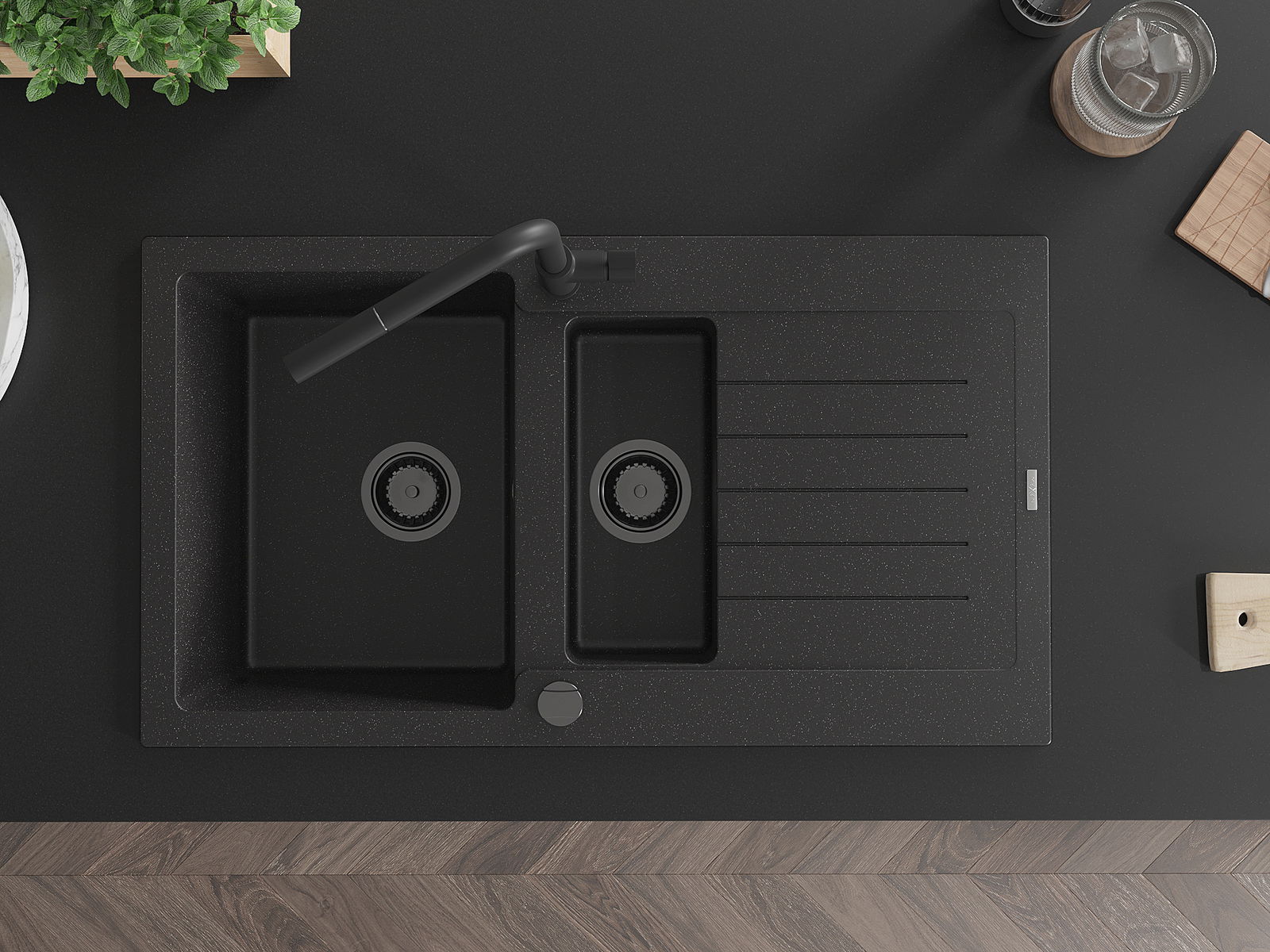 Mexen Matias granitový dřez 1,5-komorový s odkapávačem a kuchyňskou baterií Flora, černý/stříbrný - 6502-73-670401-70-B