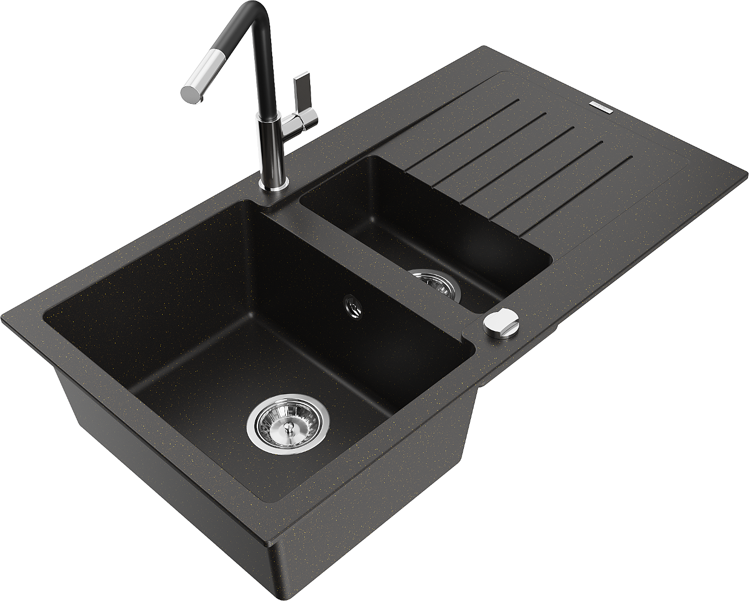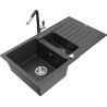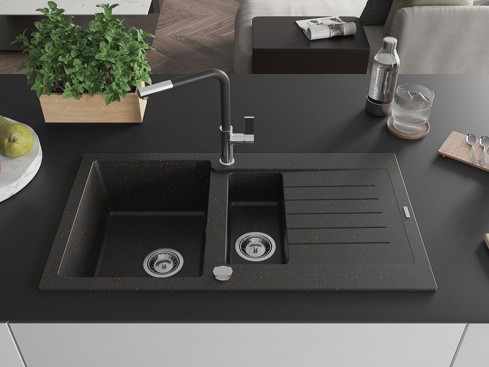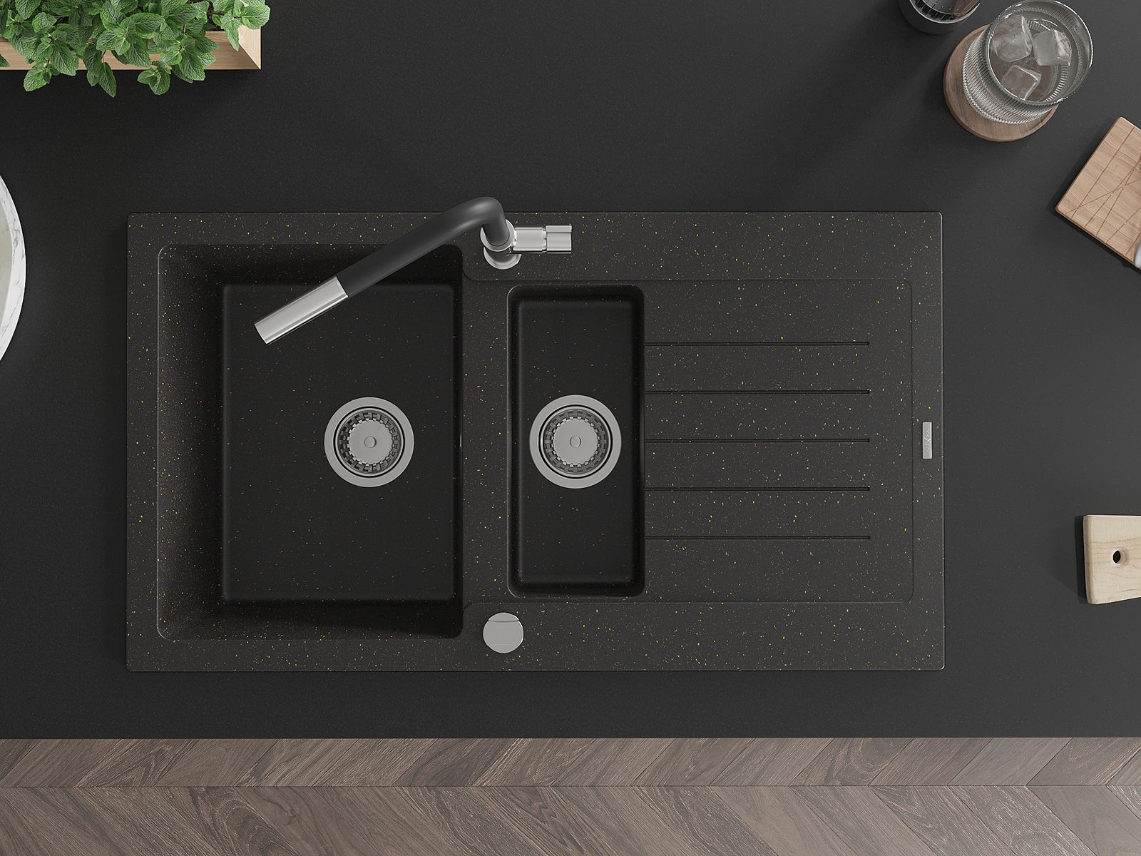 Mexen Matias dřez granitový 1,5-komorový s odkapávačem a kuchyňskou baterií Flora, černý/zlatý metalik - 6502-75-670401-07