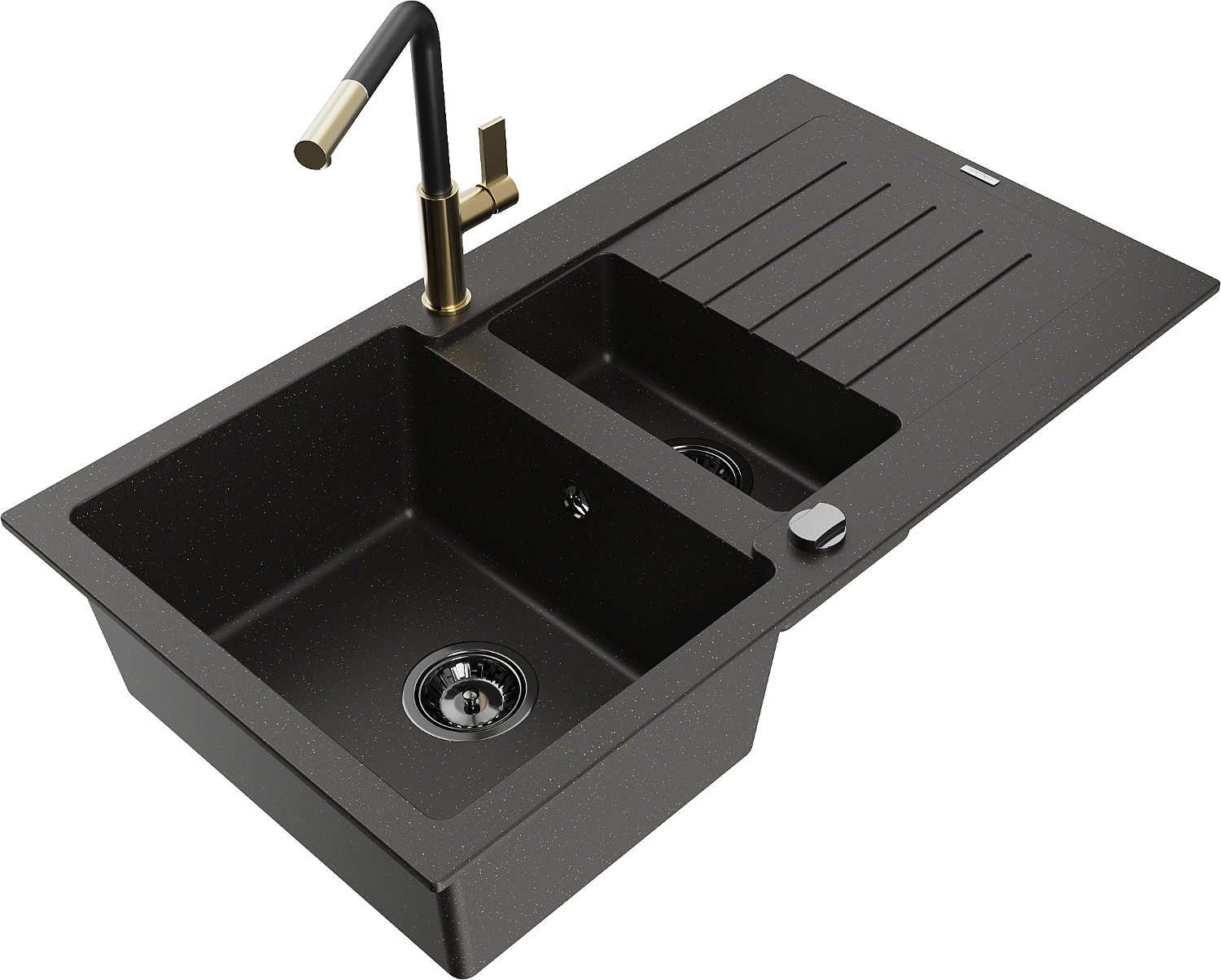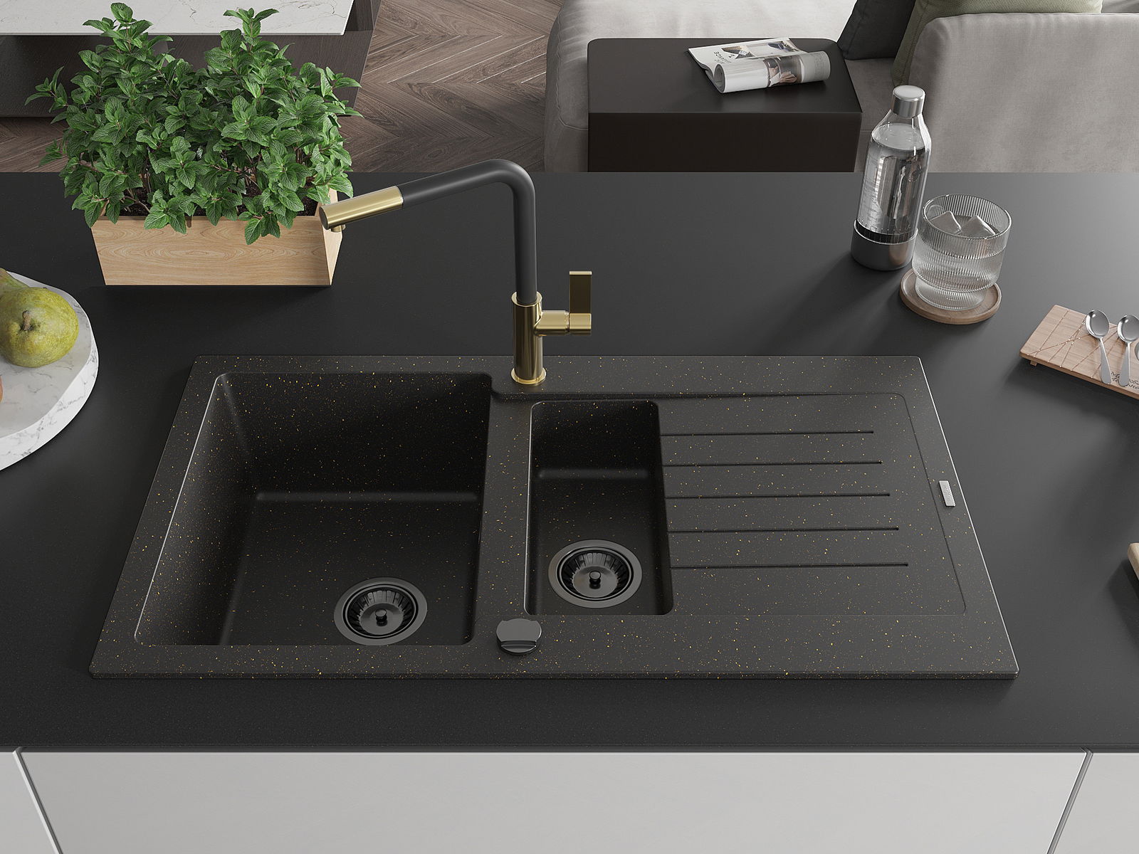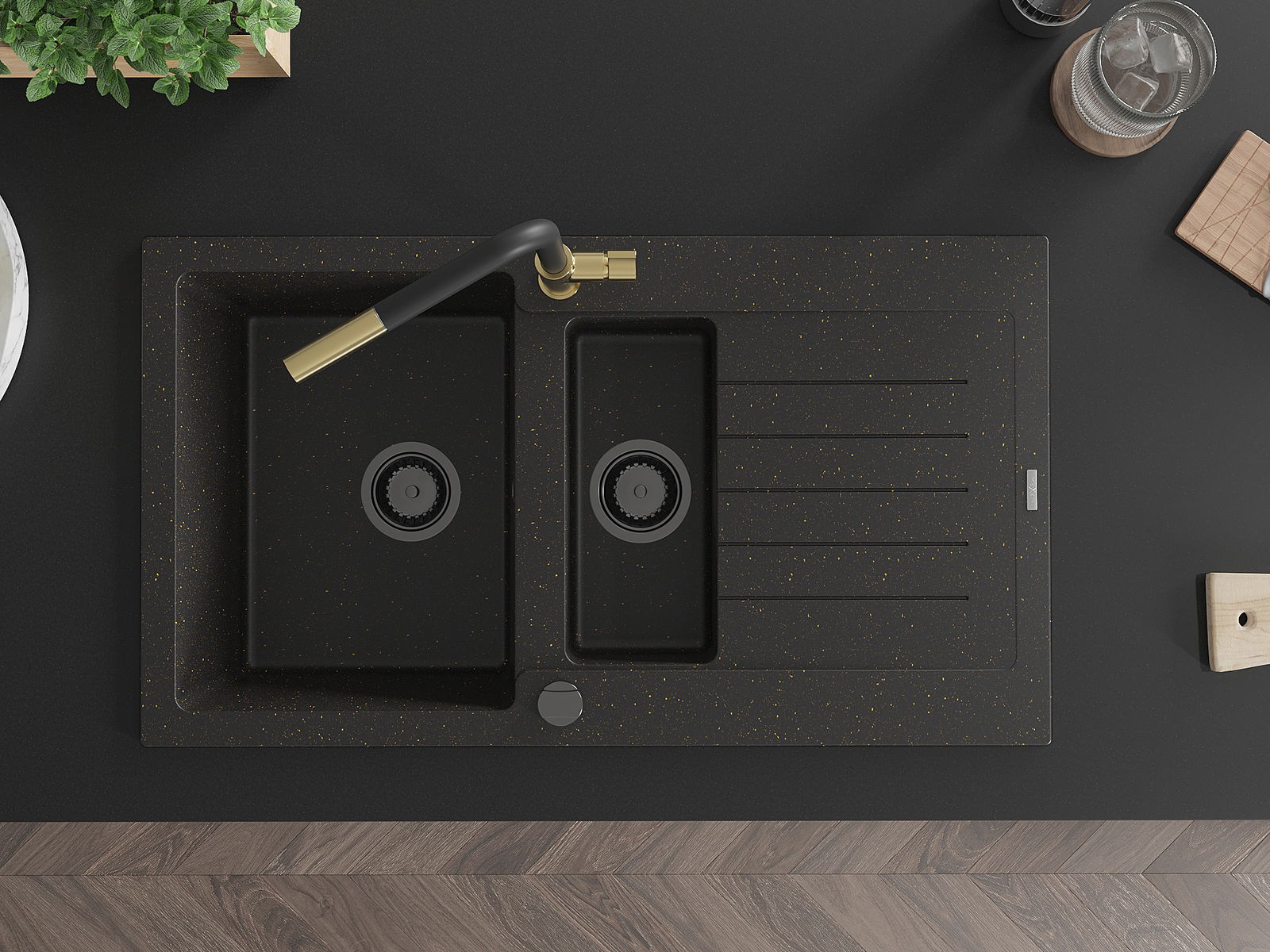 Mexen Matias granitový dřez 1,5-komorový s odkapávačem a kuchyňskou baterií Flora, černý/zlatý - 6502-75-670401-57-B