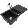 Mexen Matias granitový dřez 1,5-komorový s odkapávačem a kuchyňskou baterií Flora, černý skvrnitý - 6502-76-670401-07