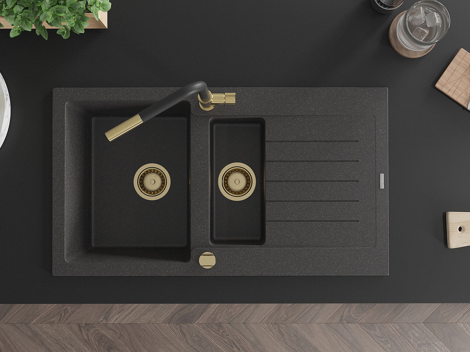 Mexen Matias kameninový dřez s 1,5 komorou a odkapávačem a kuchyňskou baterií Flora, černý skvrnitý - 6502-76-670401-57-G
