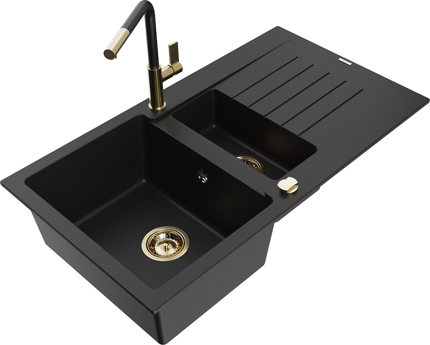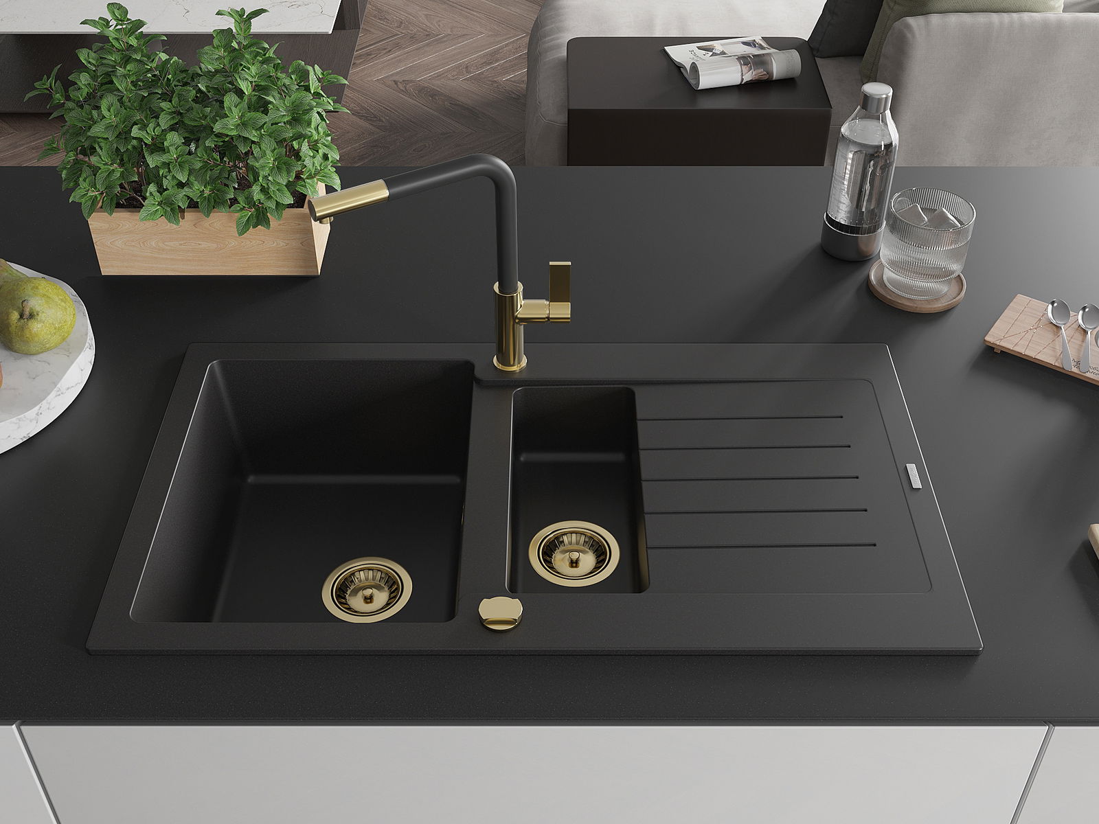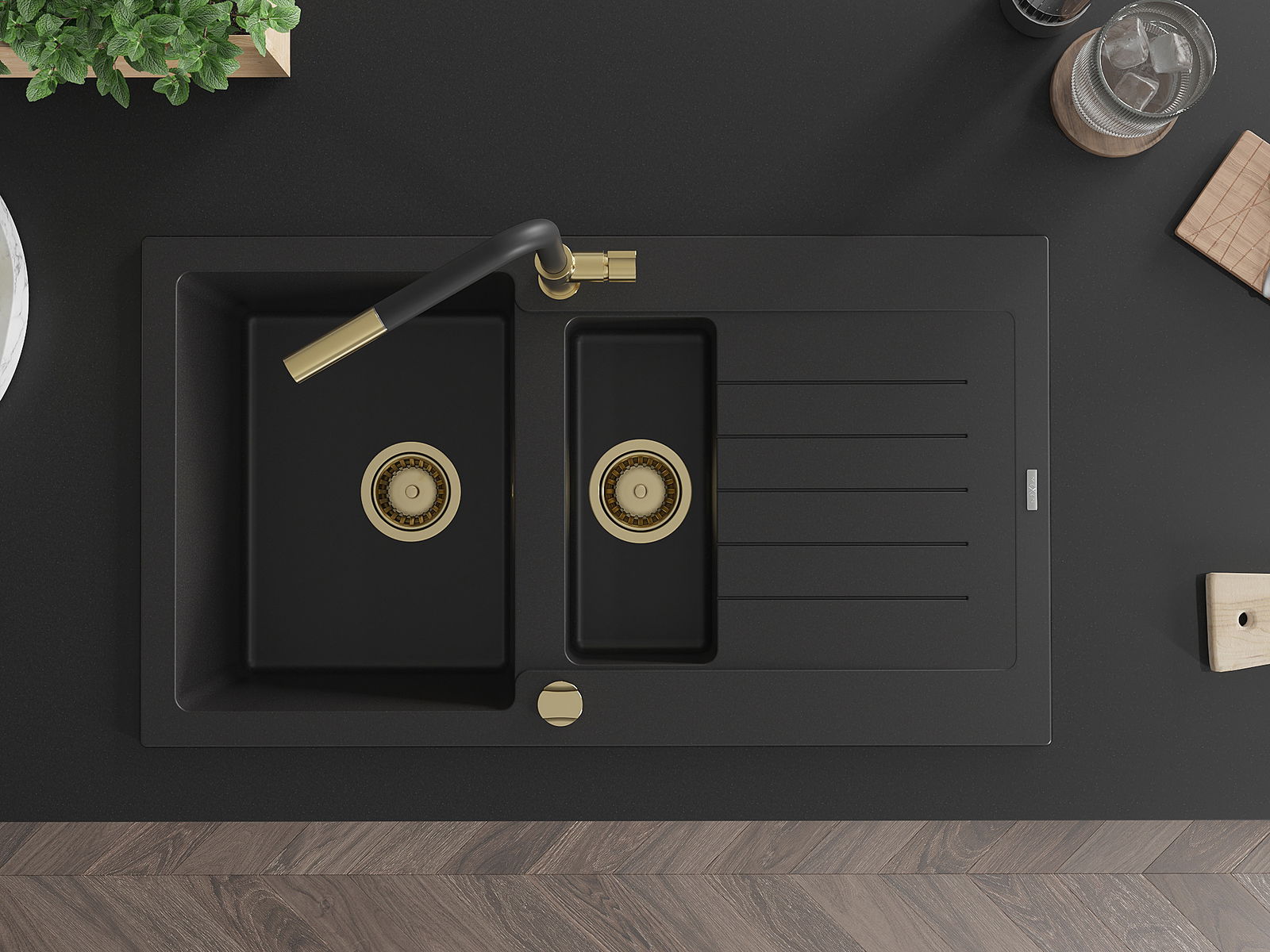 Mexen Matias granitový dřez 1,5-komorový s odkapávačem a kuchyňskou baterií Flora, černý - 6502-77-670401-57-G