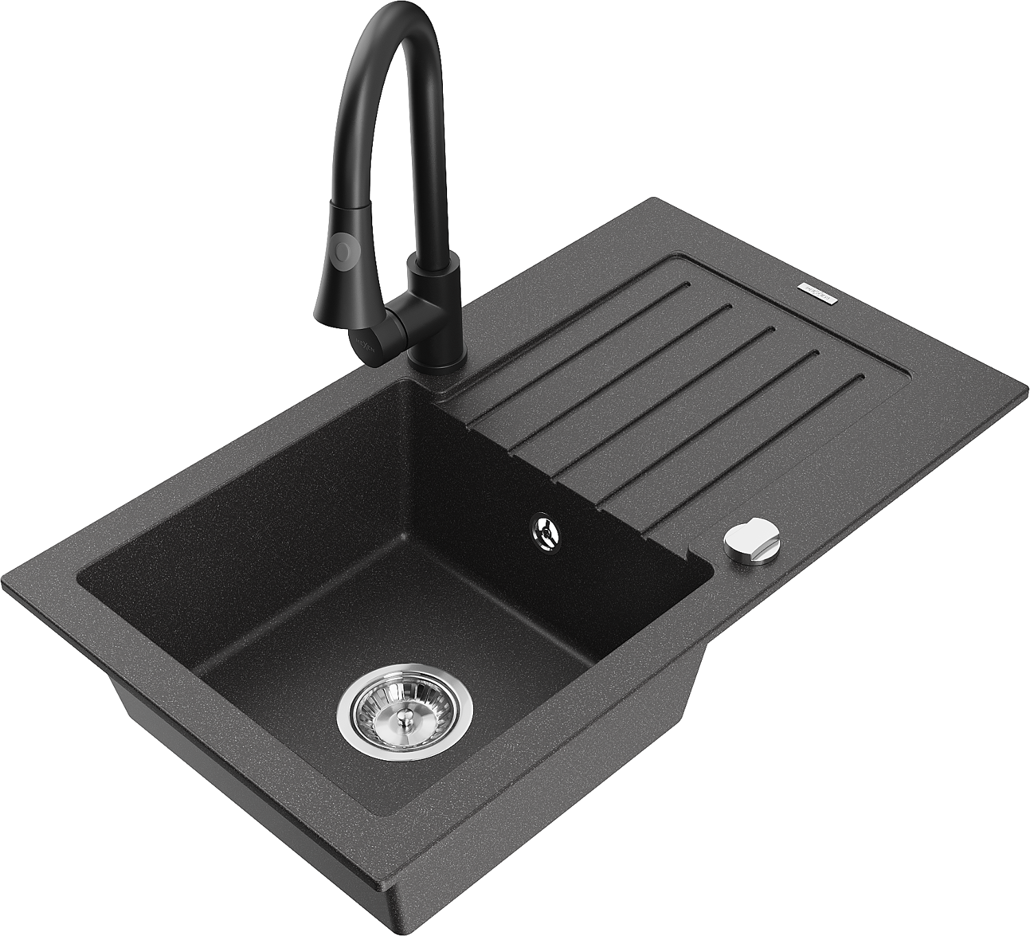 Mexen Pablo granitový dřez 1-komorový s odkapávačem a kuchyňskou baterií Elia, černý skvrnitý - 6510-76-670101-70