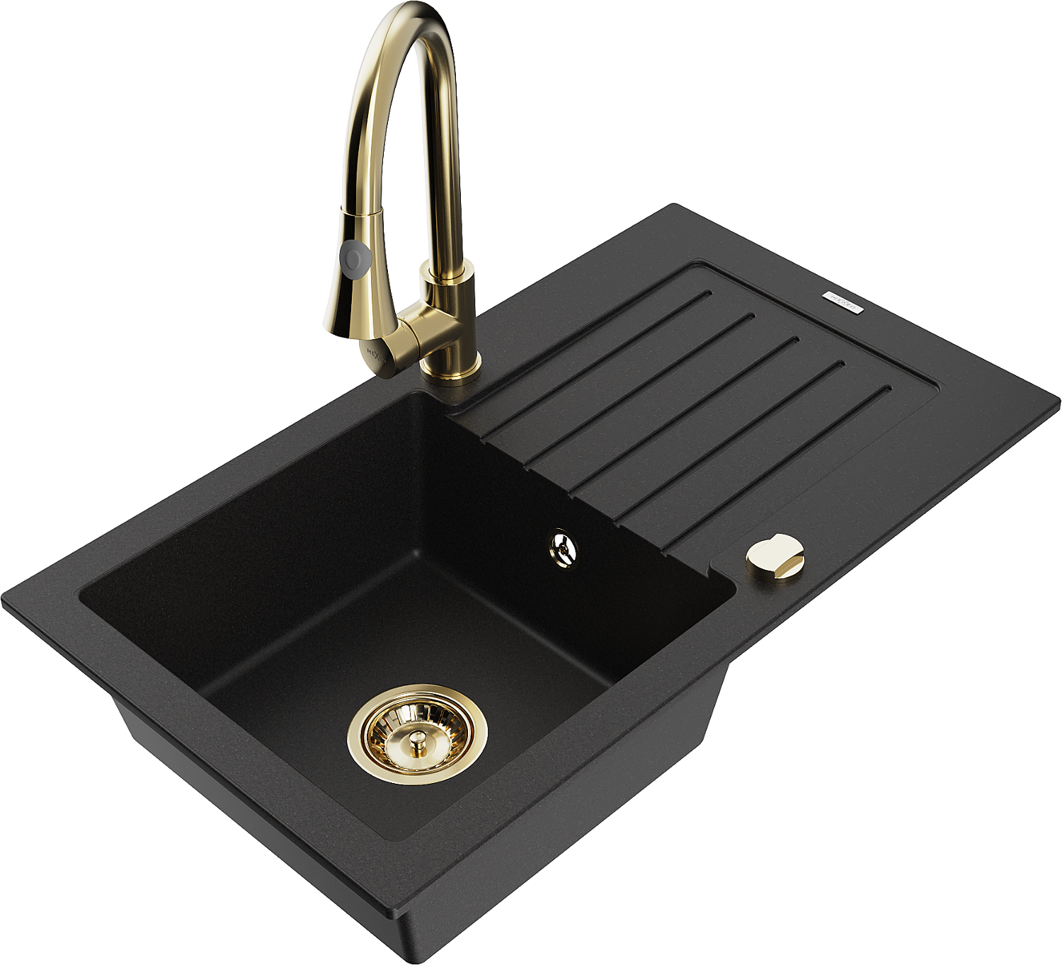 Mexen Pablo granitový dřez s 1 komorou a odkapávačem a kuchyňskou baterií Elia, černý - 6510-77-670101-50