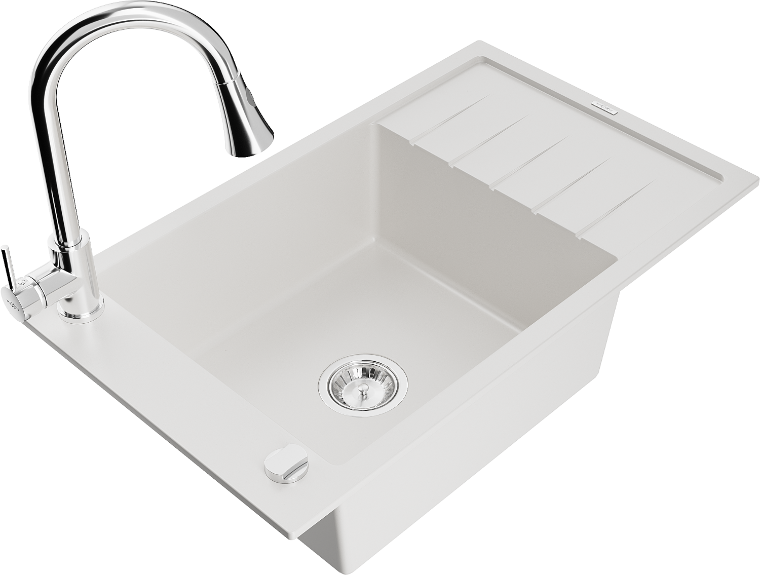 Mexen Elias granitový dřez s 1 komorou a odkapávačem a kuchyňskou baterií Elia, bílý - 6511-20-670101-00