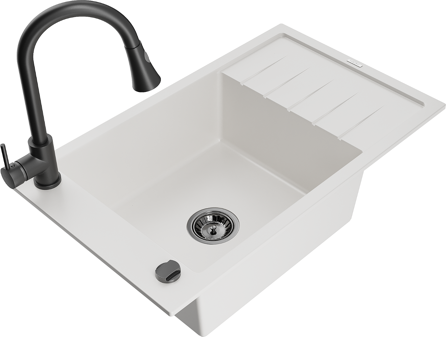 Mexen Elias granitový dřez 1-komorový s odkapávačem a kuchyňskou baterií Elia, bílý - 6511-20-670101-70