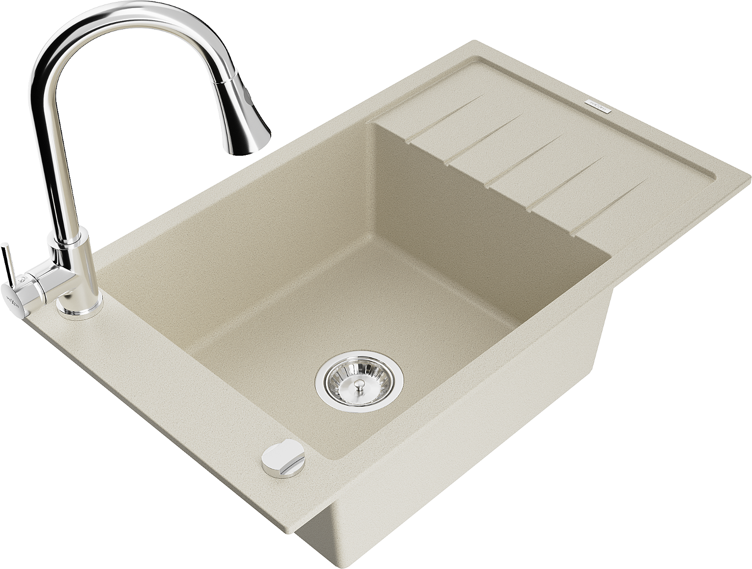 Mexen Elias granitový dřez 1-komorový s odkapávačem a kuchyňskou baterií Elia, béžový - 6511-69-670101-00