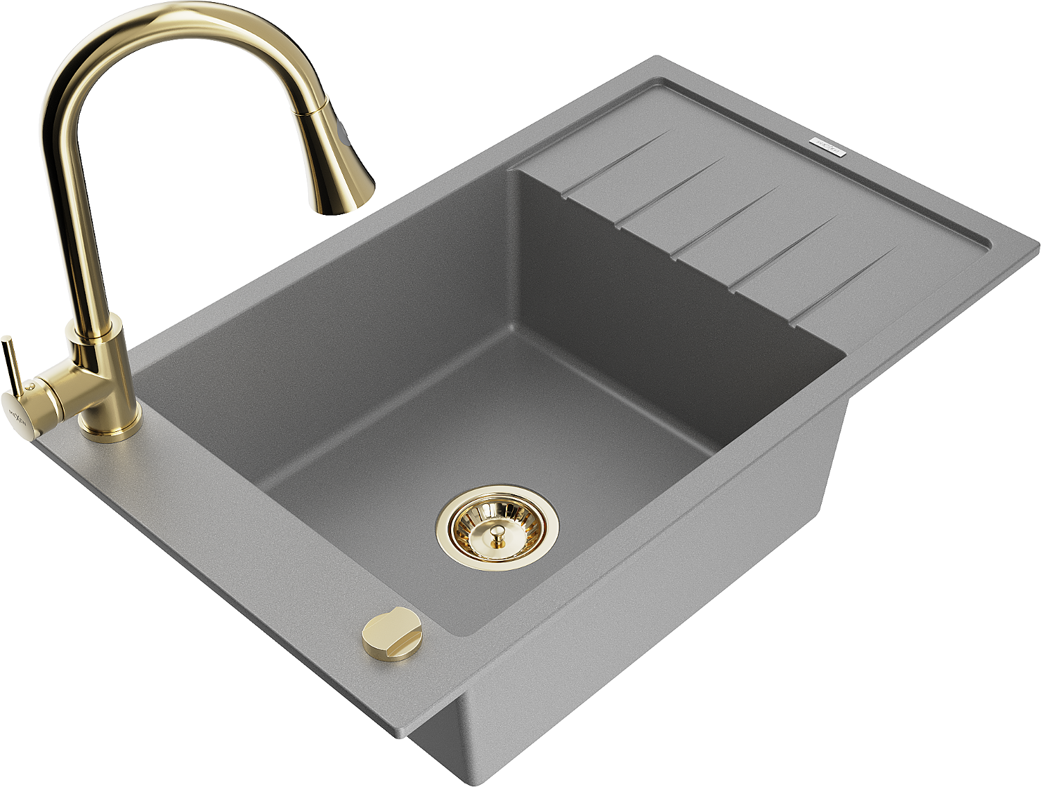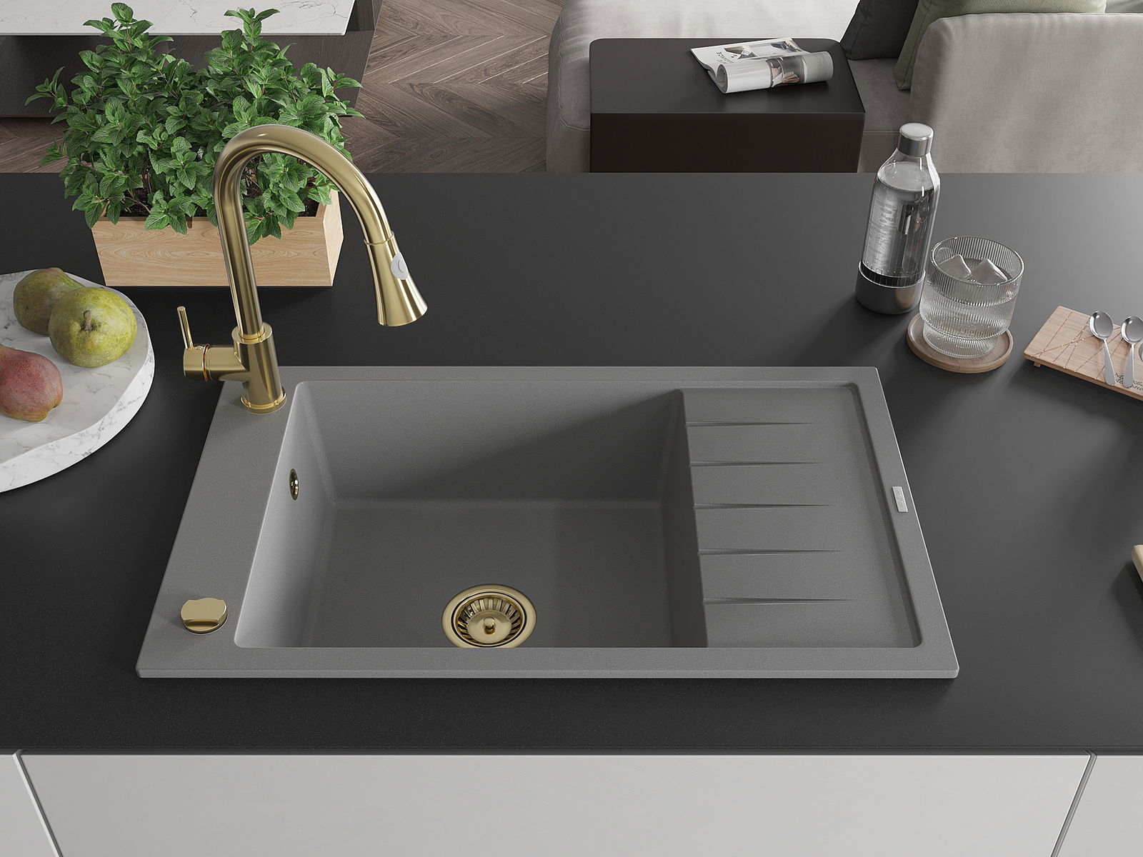 Mexen Elias granitový dřez 1-komorový s odkapávačem a kuchyňskou baterií Elia, šedý - 6511-71-670101-50