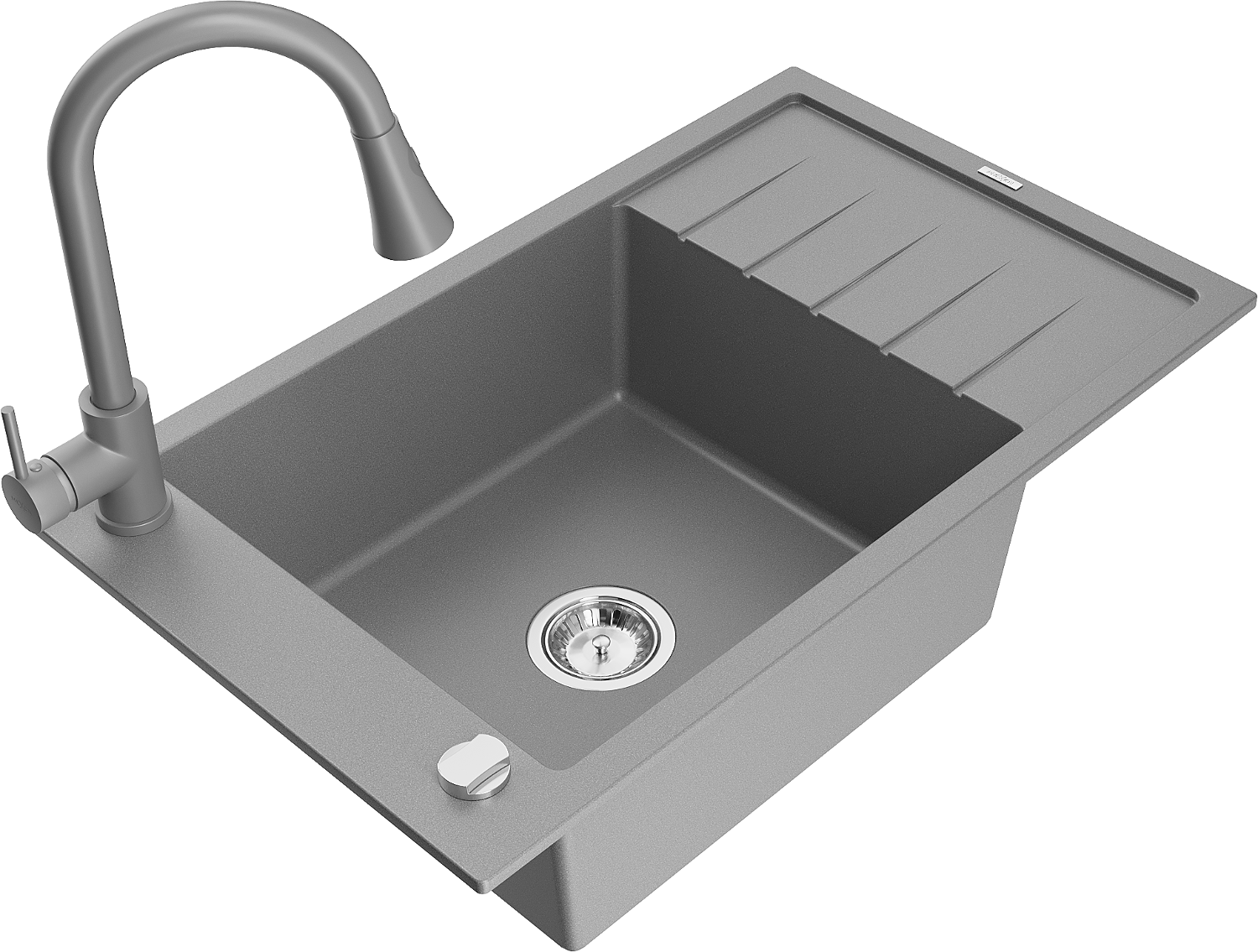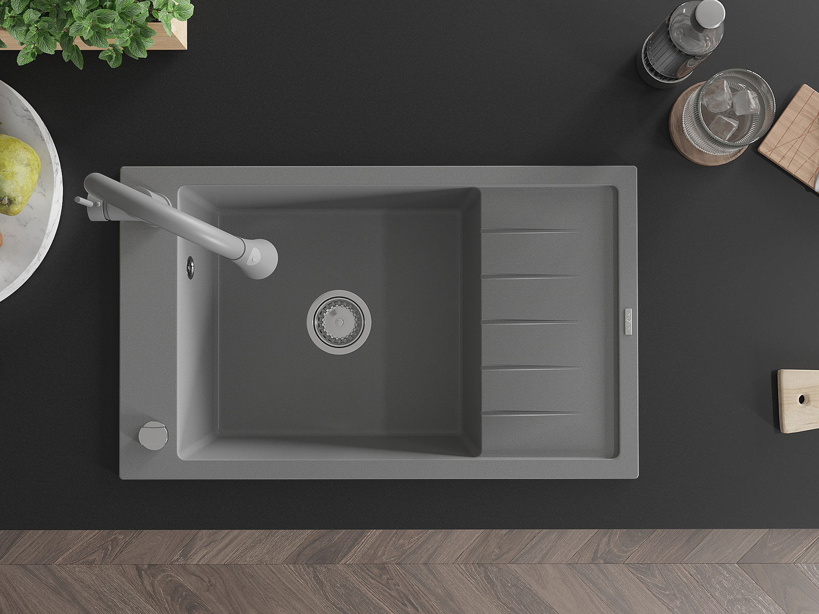 Mexen Elias granitový dřez 1-komorový s odkapávačem a kuchyňskou baterií Elia, šedý - 6511-71-670101-71