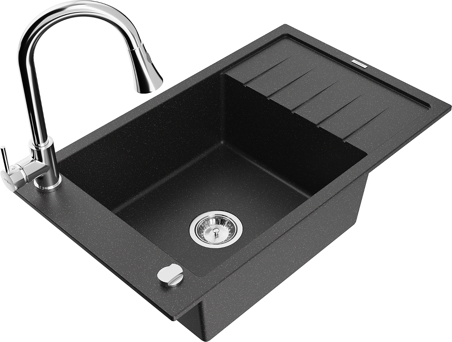 Mexen Elias granitový dřez 1-komorový s odkapávačem a kuchyňskou baterií Elia, černý/stříbrný metalík - 6511-73-670101-00