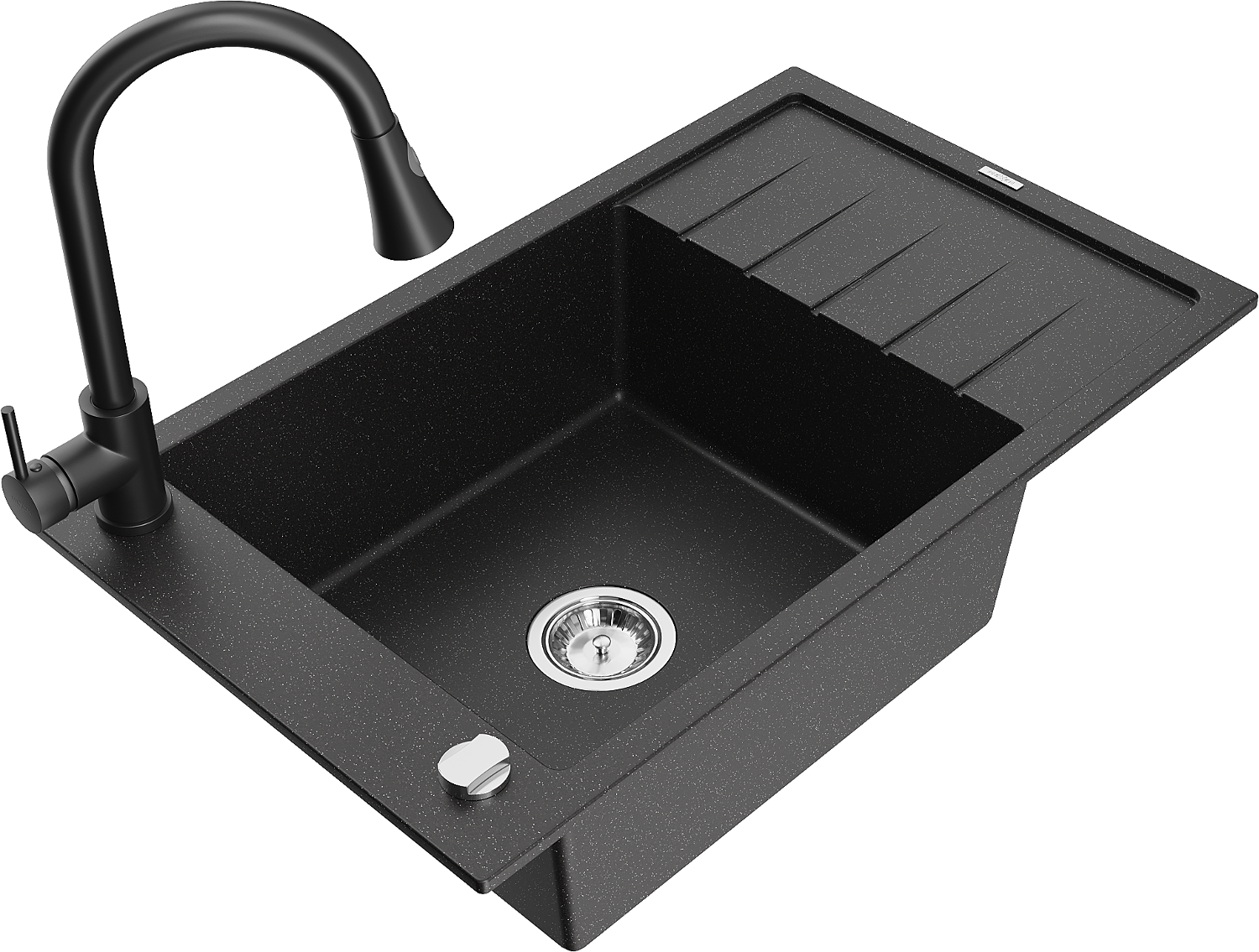 Mexen Elias granitový dřez s 1 komorou, odkapávačem a kuchyňskou baterií Elia, černý/stříbrný metalik - 6511-73-670101-70