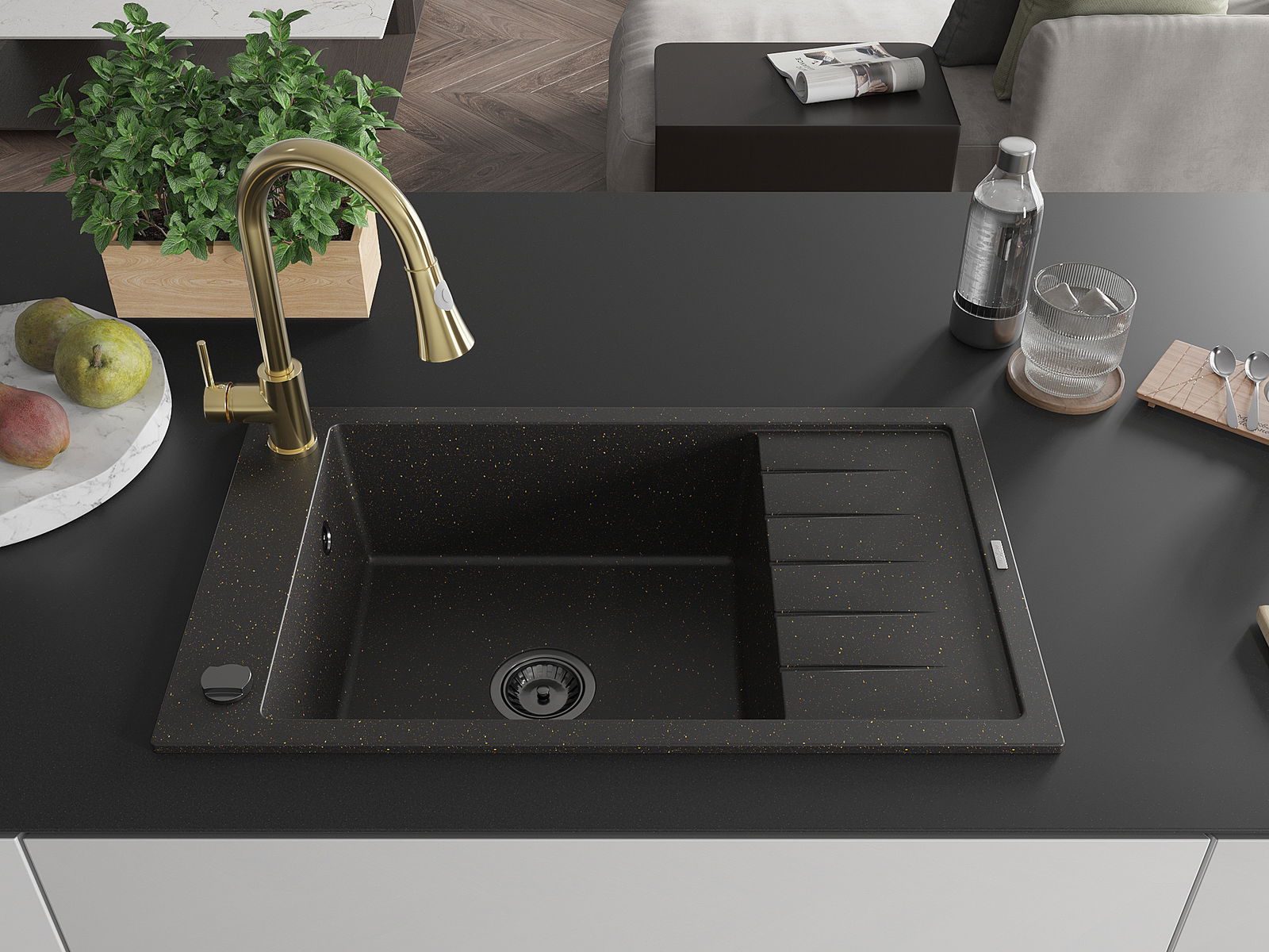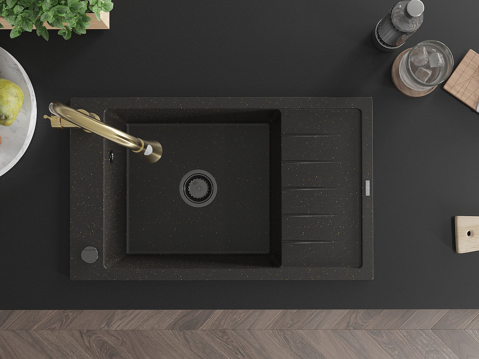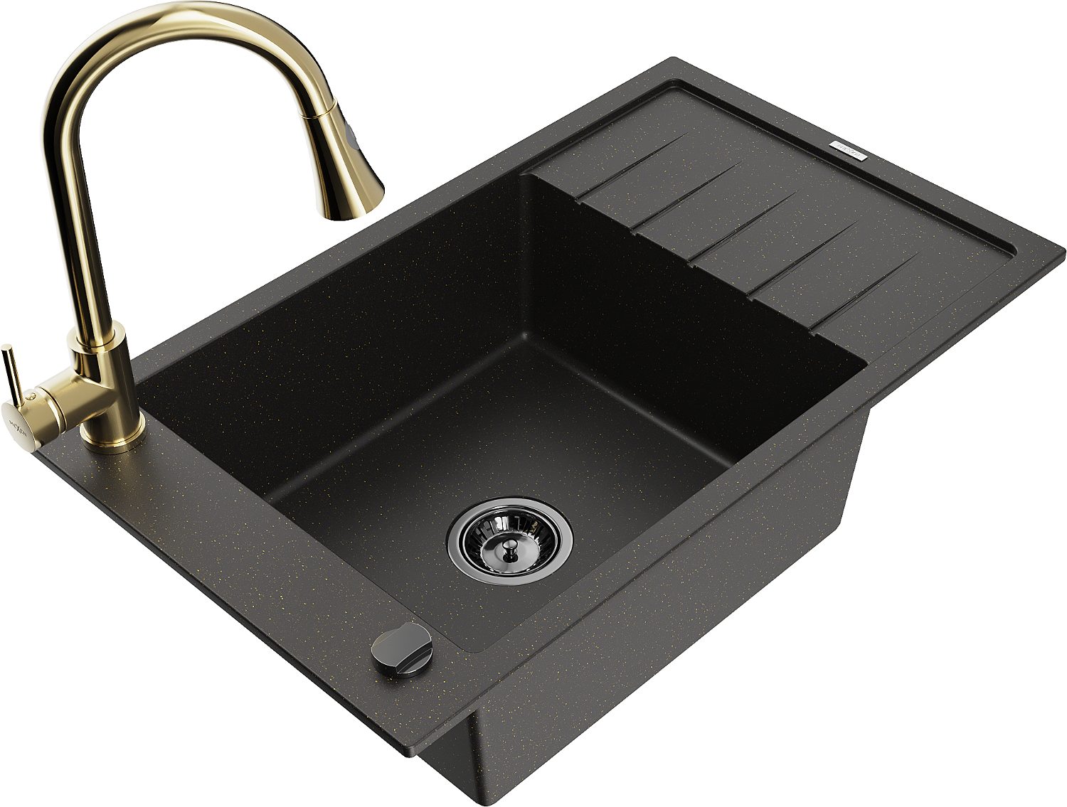 Mexen Elias granitový dřez s jednou komorou, odkapávačem a kuchyňskou baterií Elia, černý/zlatý metalik - 6511-75-670101-50-B