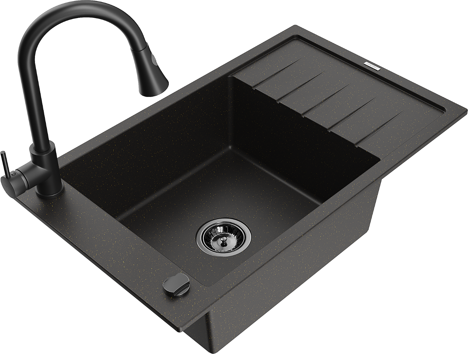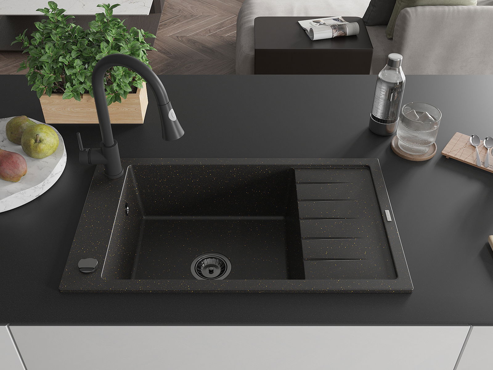 Mexen Elias granitový dřez s 1 komorou a odkapávačem a kuchyňskou baterií Elia, černý/zlatý metalický - 6511-75-670101-70-B