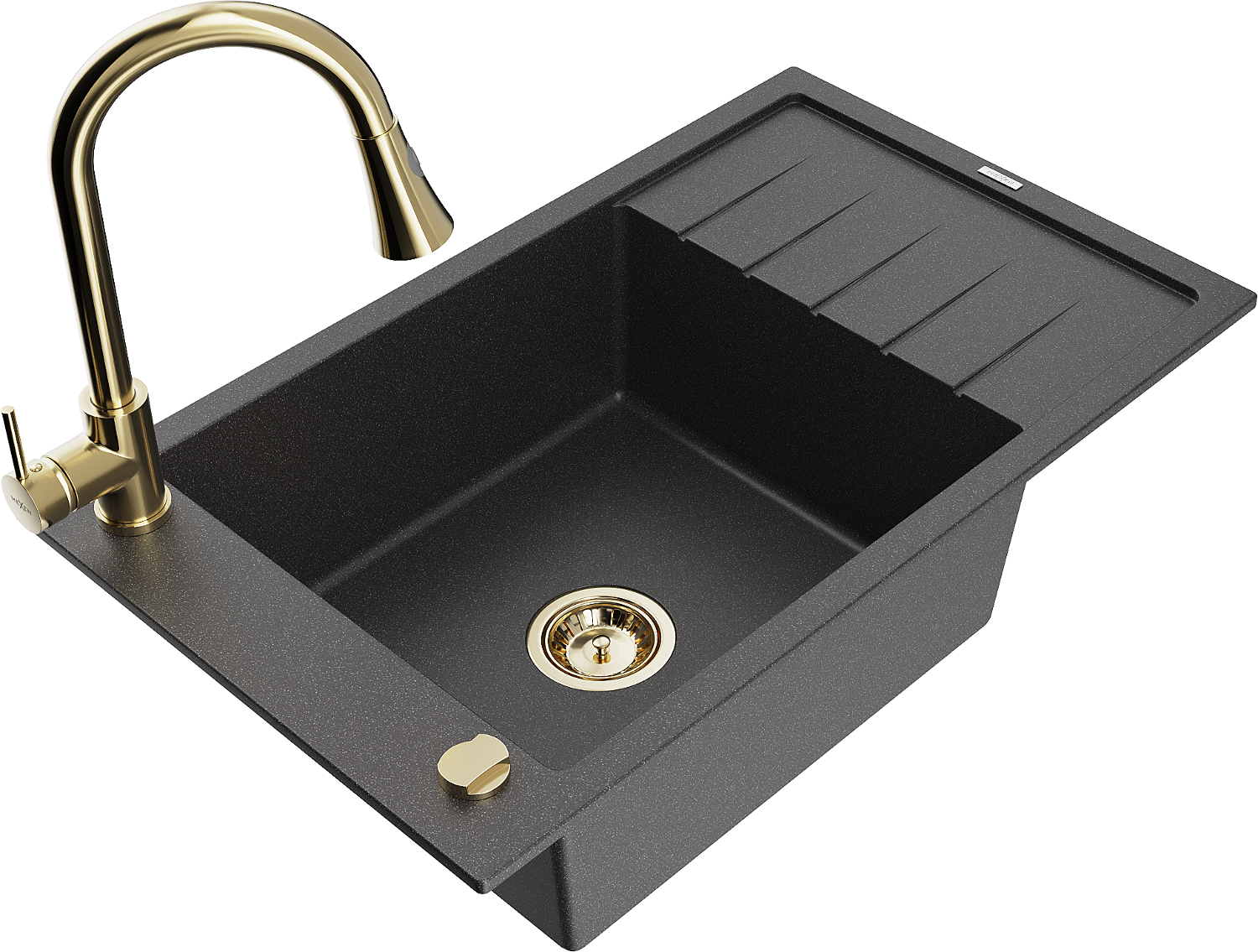 Mexen Elias granitový dřez 1-komorový s odkapávačem a kuchyňskou baterií Elia, černý skvrnitý - 6511-76-670101-50