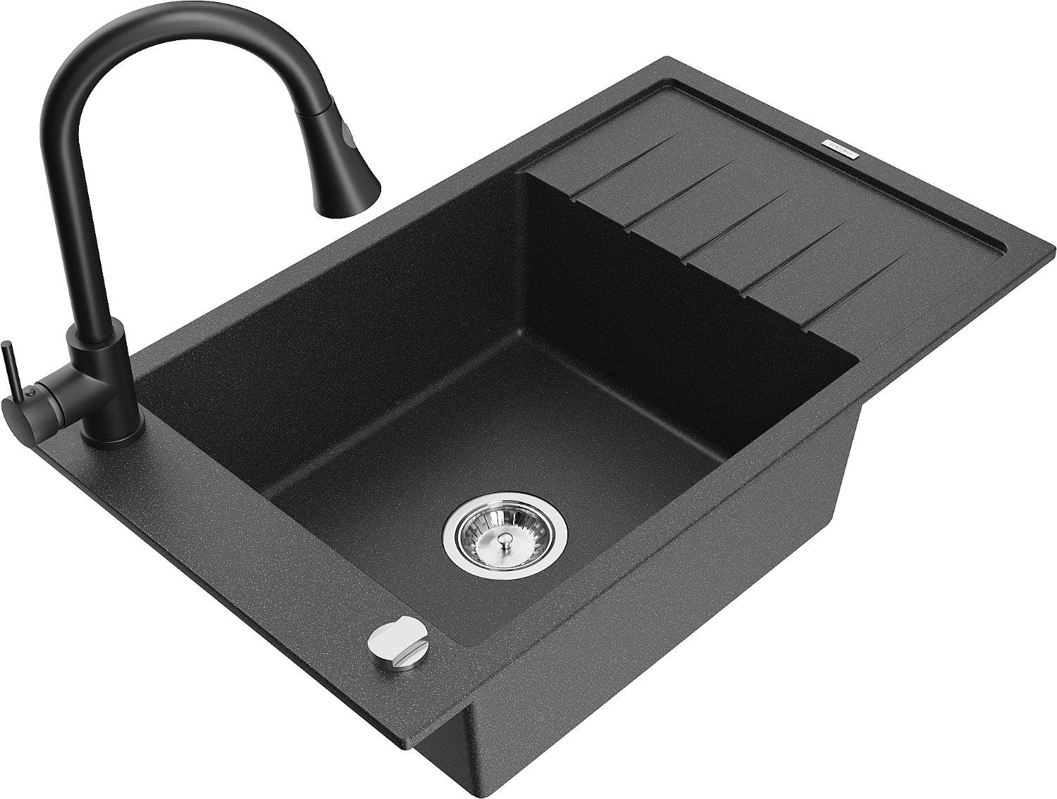 Mexen Elias granitový dřez jednokomorový s odkapávačem a kuchyňskou baterií Elia, černý skvrnitý - 6511-76-670101-70