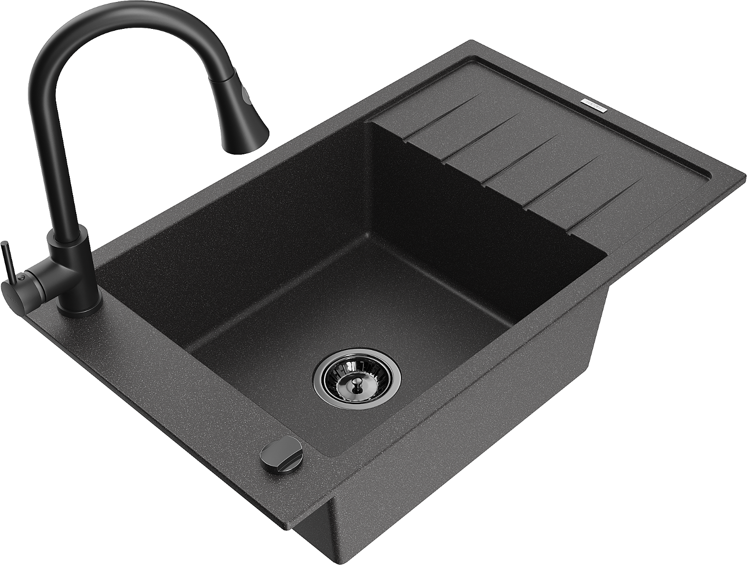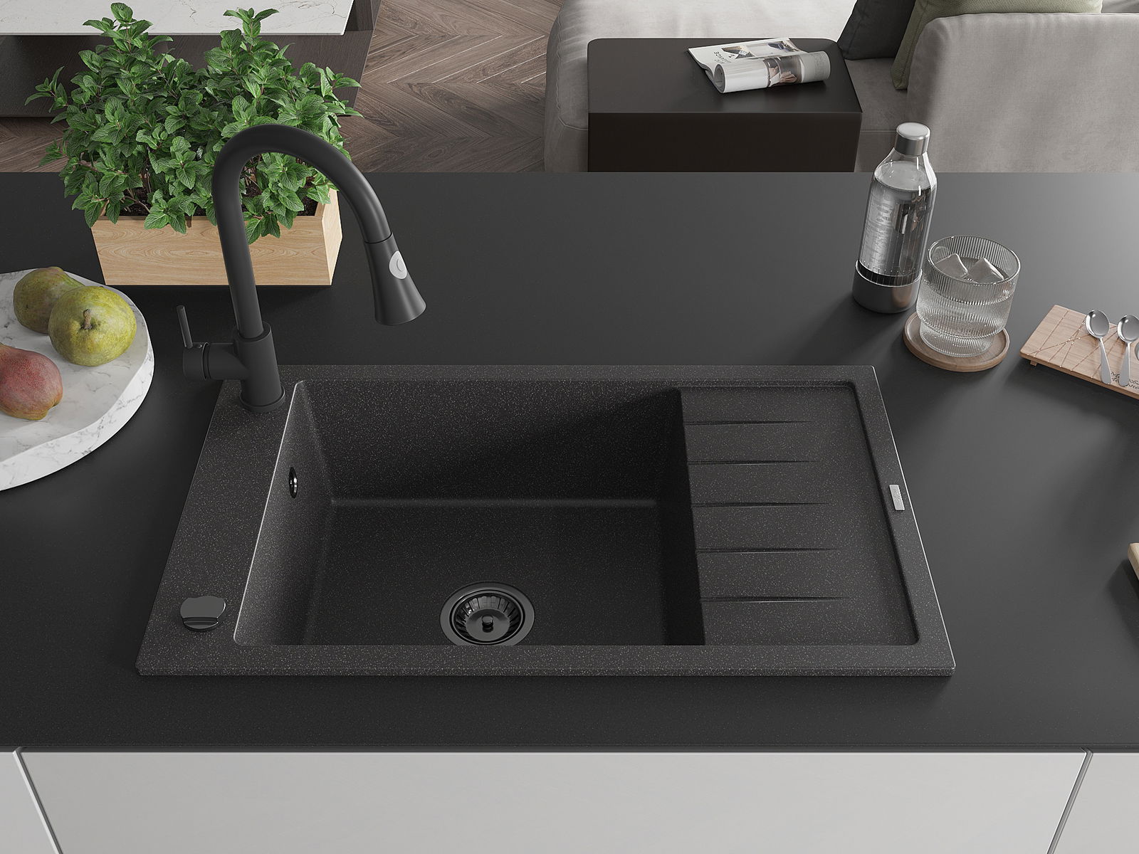 Mexen Elias granitový dřez s 1 komorou, odkapávačem a kuchyňskou baterií Elia, černý skvrnitý - 6511-76-670101-70-B