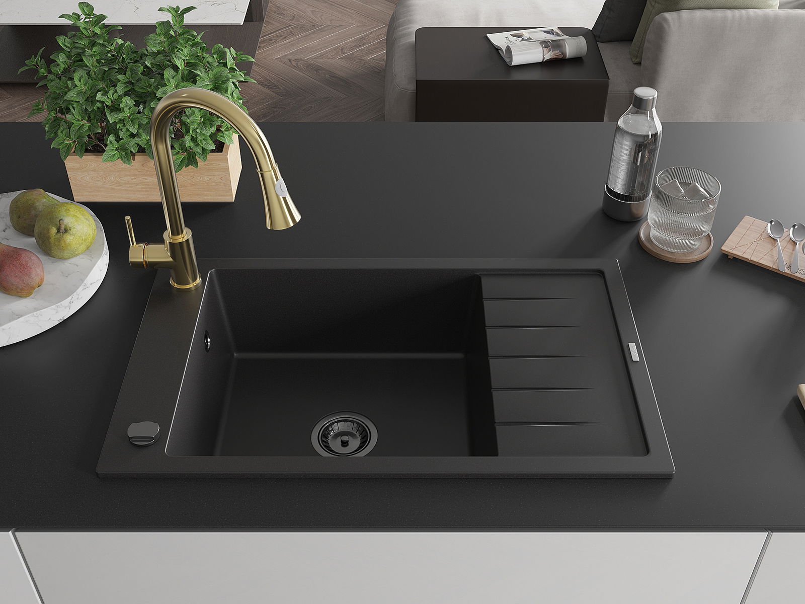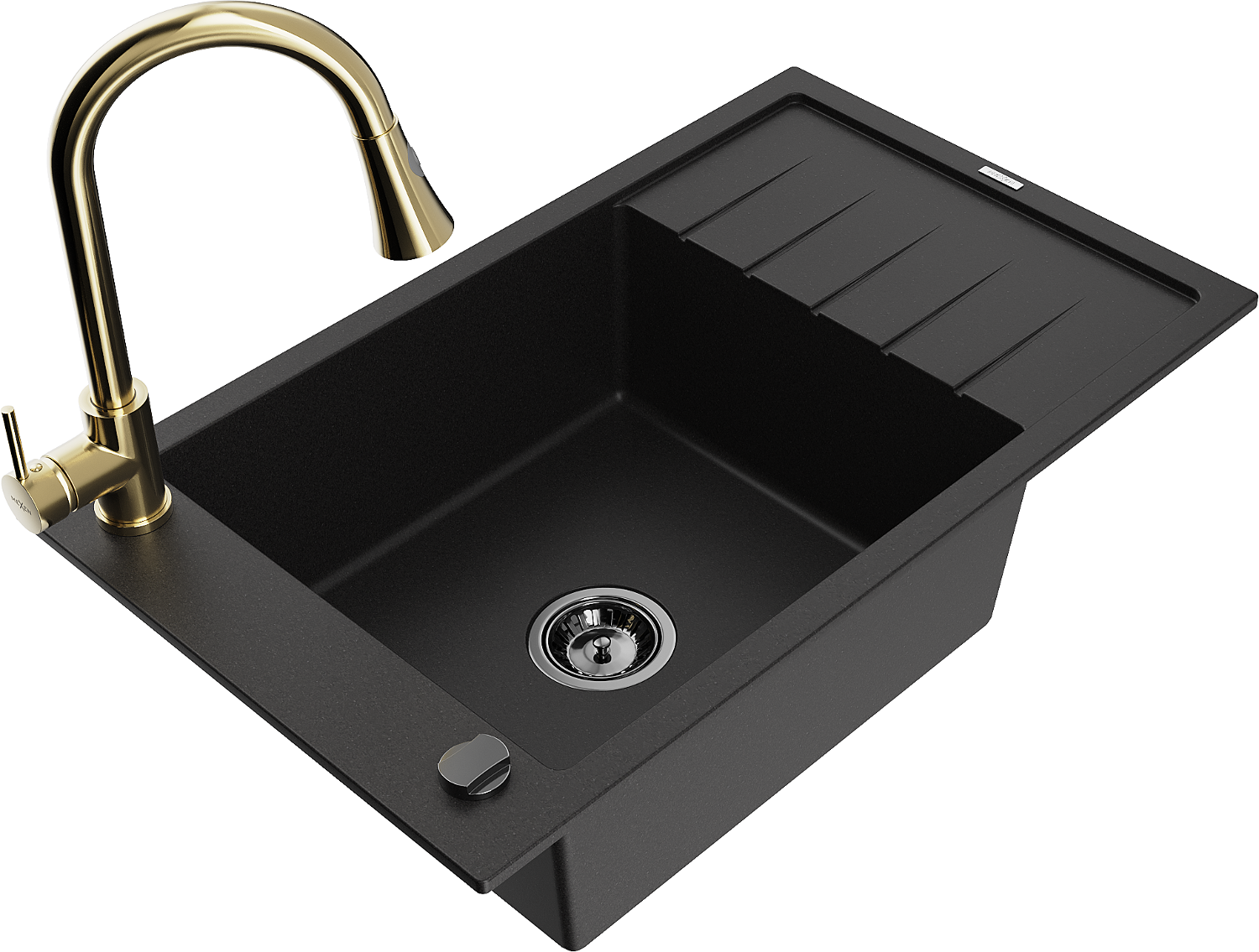 Mexen Elias žulový dřez 1-komorový s odkapávačem a kuchyňskou baterií Elia, černý - 6511-77-670101-50-B