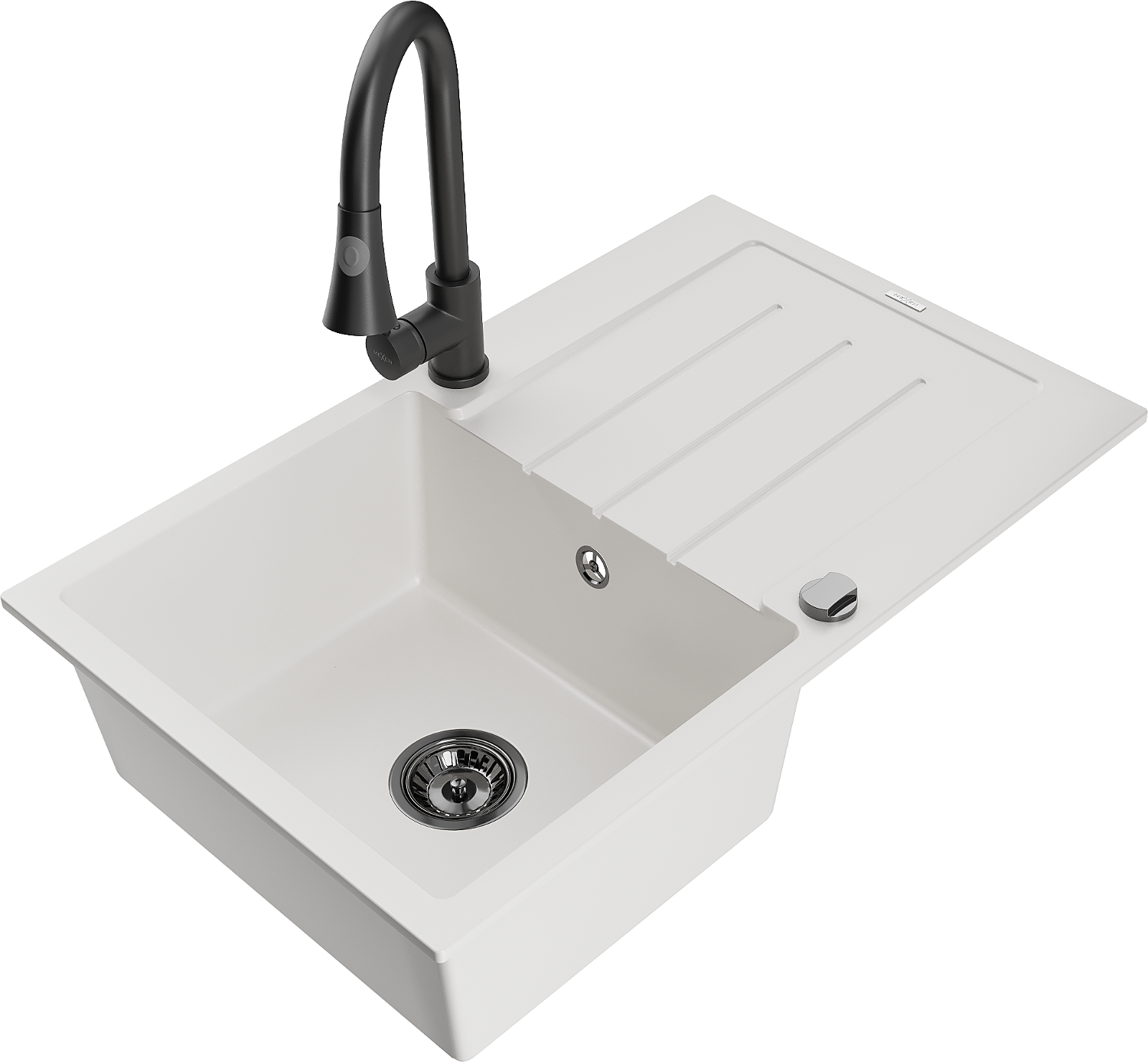Mexen Bruno granitový dřez 1-komorový s odkapávačem a kuchyňskou baterií Elia, bílá - 6513-20-670101-70