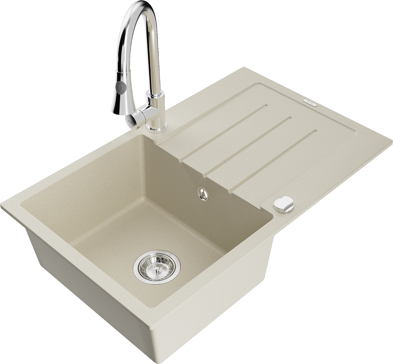 Mexen Bruno granitový dřez 1-komorový s odkapávačem a kuchyňskou baterií Elia, béžový - 6513-69-670101-00