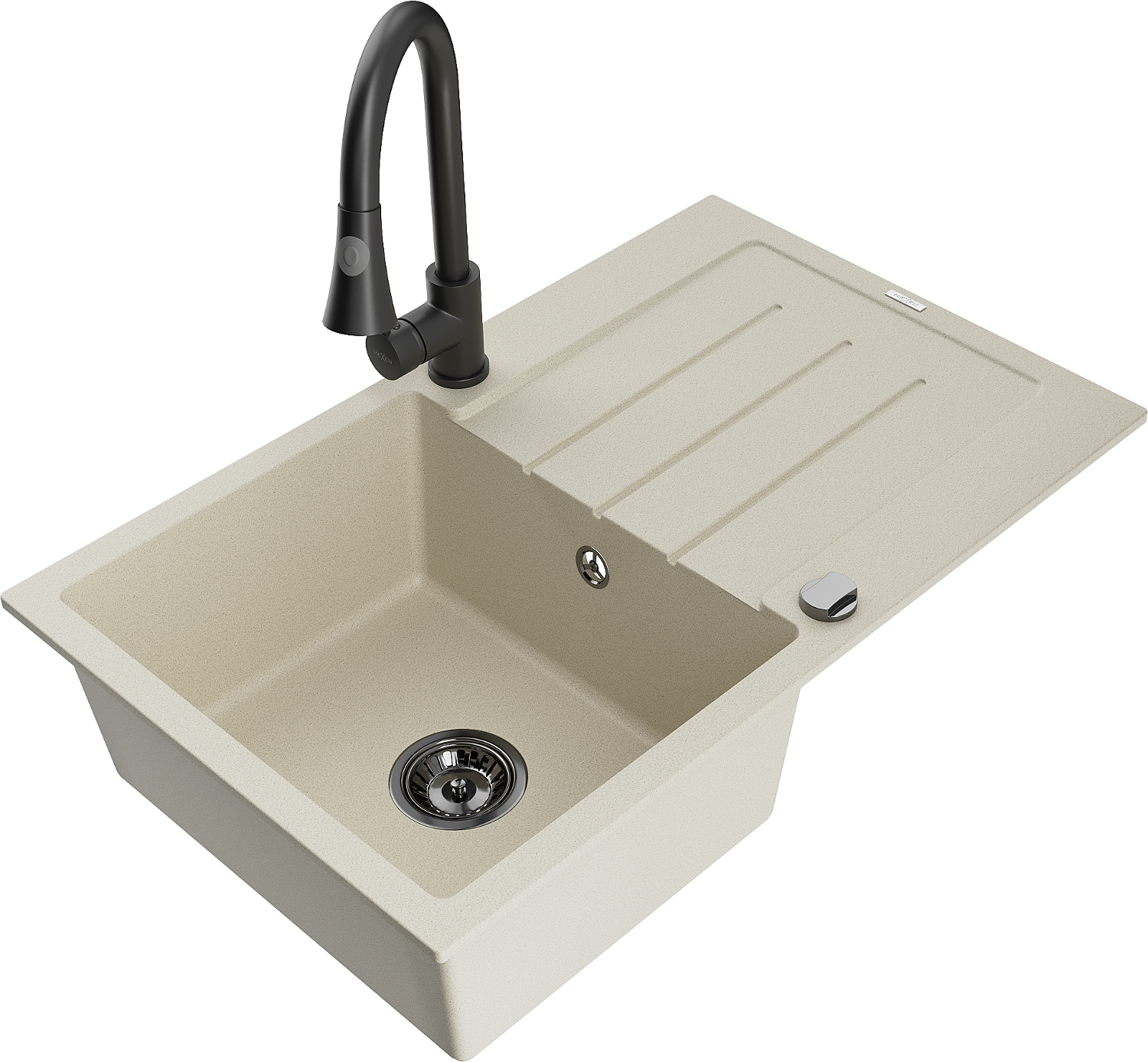 Mexen Bruno granitový dřez s jednou komorou s odkapávačem a kuchyňskou baterií Elia, béžová - 6513-69-670101-70