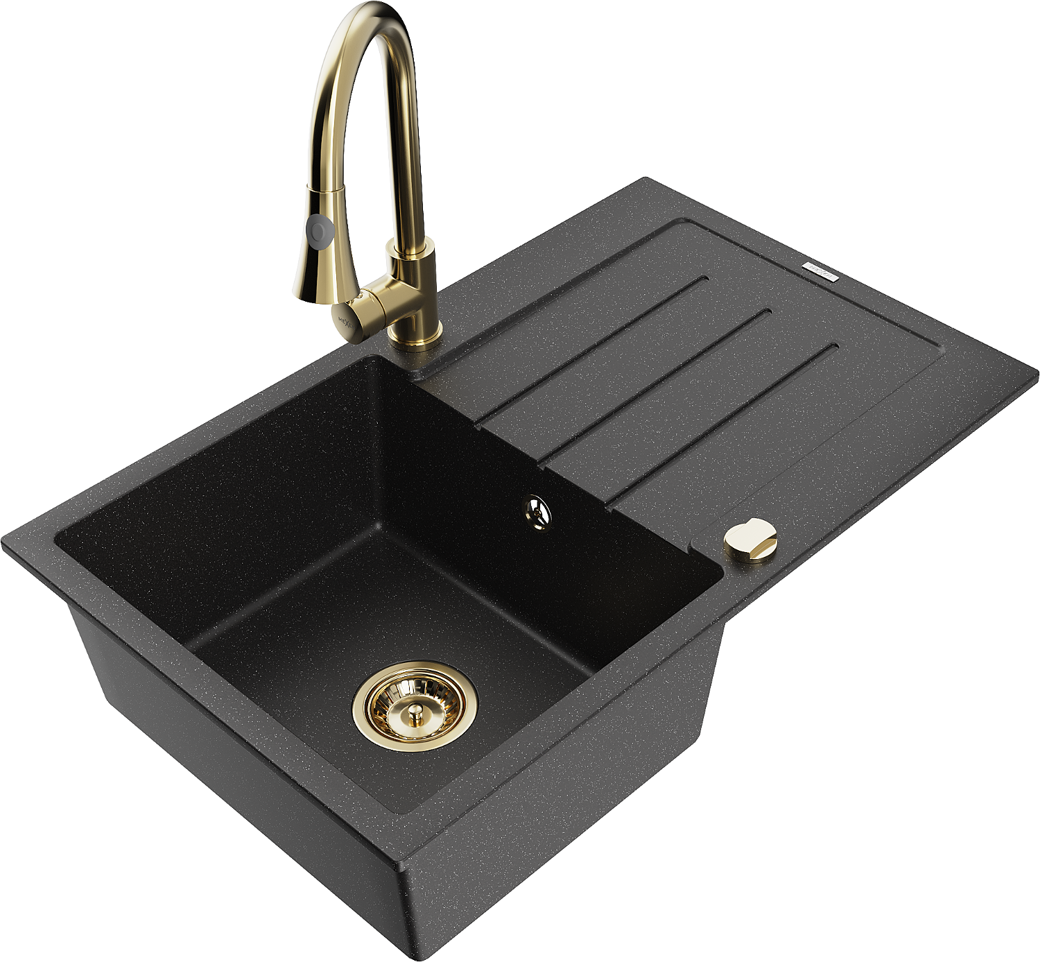 Mexen Bruno granitový dřez 1-komorový s odkapávačem a kuchyňskou baterií Elia, černý/stříbrný metalik - 6513-73-670101-50
