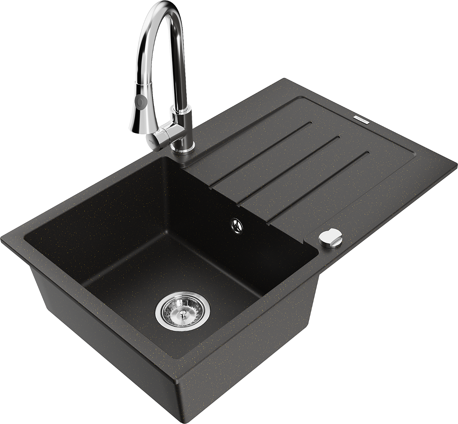 Mexen Bruno granitový dřez s jednou komorou a odkapávačem a kuchyňskou baterií Elia, černý/zlatý metalik - 6513-75-670101-00