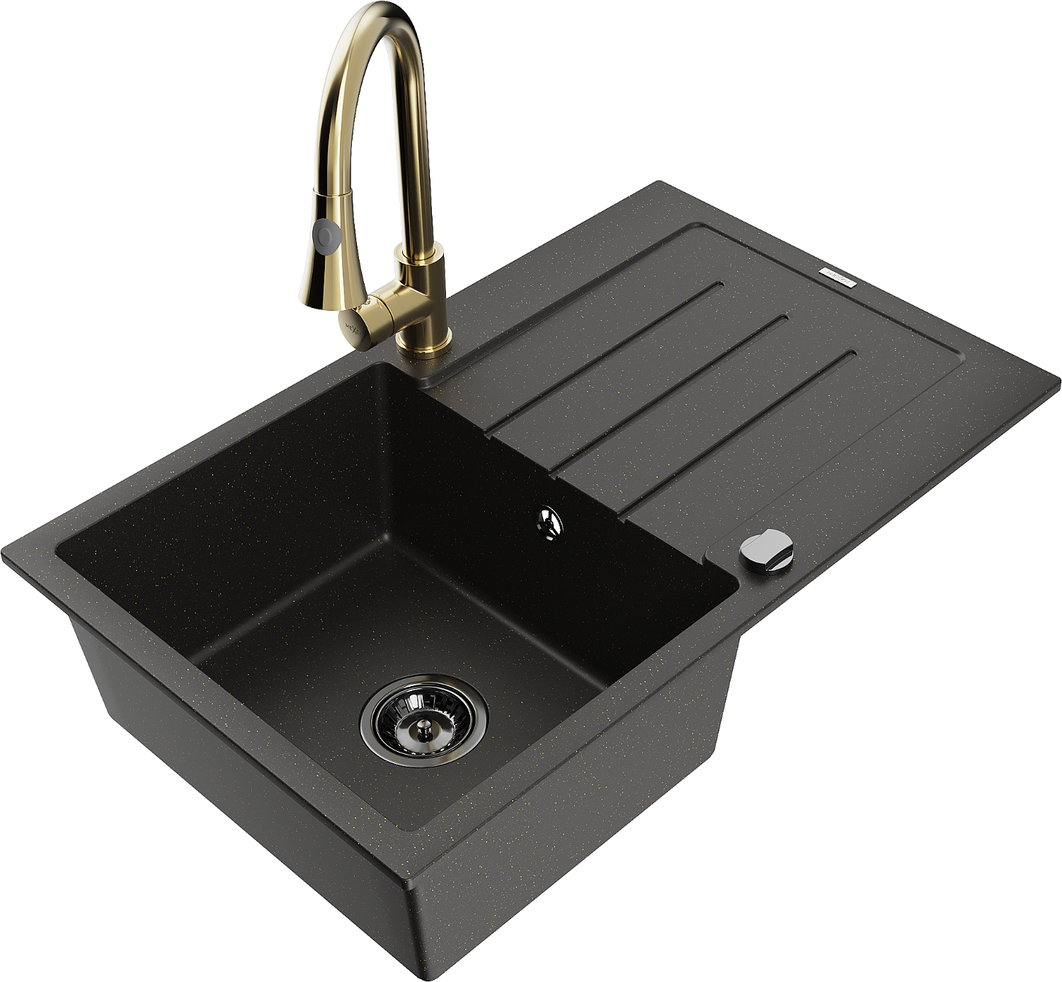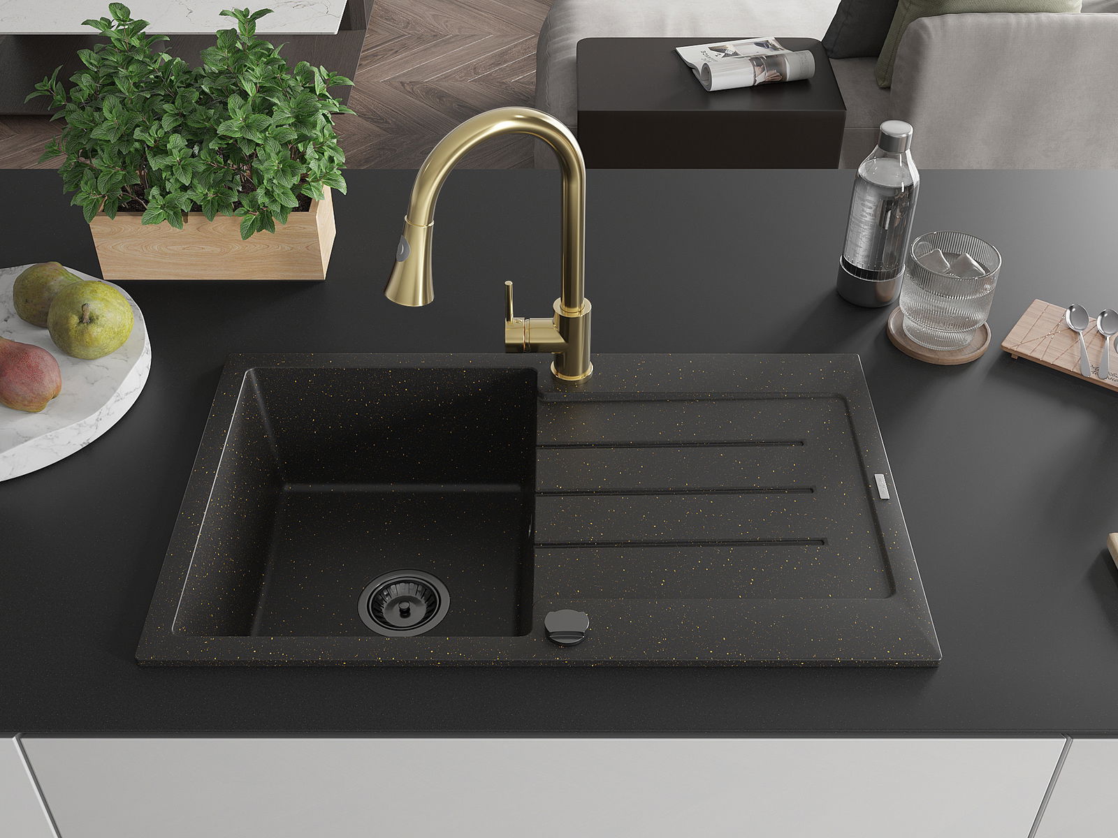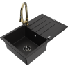 Mexen Bruno granitový dřez 1-komorový s odkapávačem a kuchyňskou baterií Elia, černý/zlatý metalik - 6513-75-670101-50-B