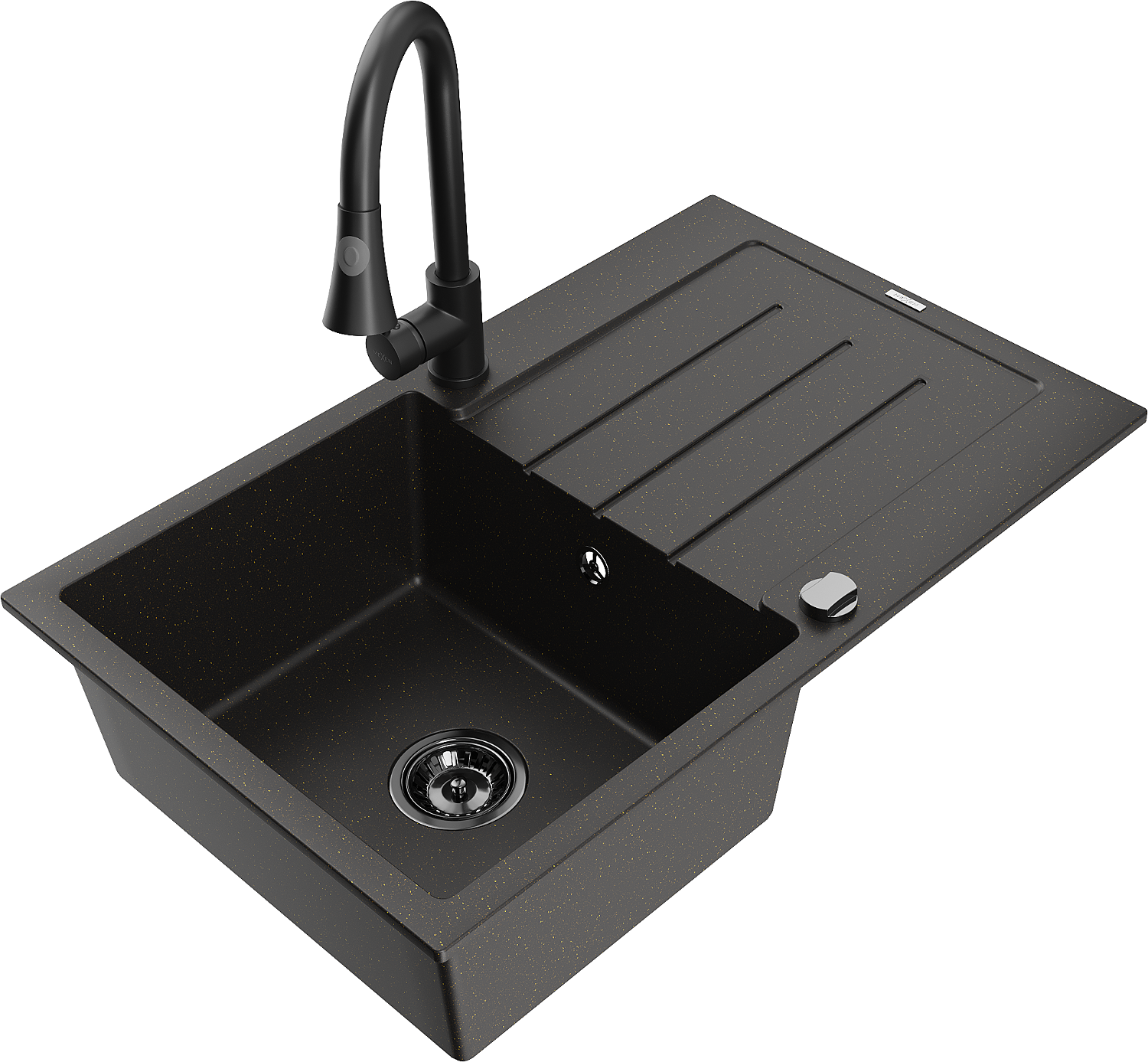 Mexen Bruno granitový dřez 1-komorový s odkapávačem a kuchyňskou baterií Elia, černý/zlatý metalik - 6513-75-670101-70-B