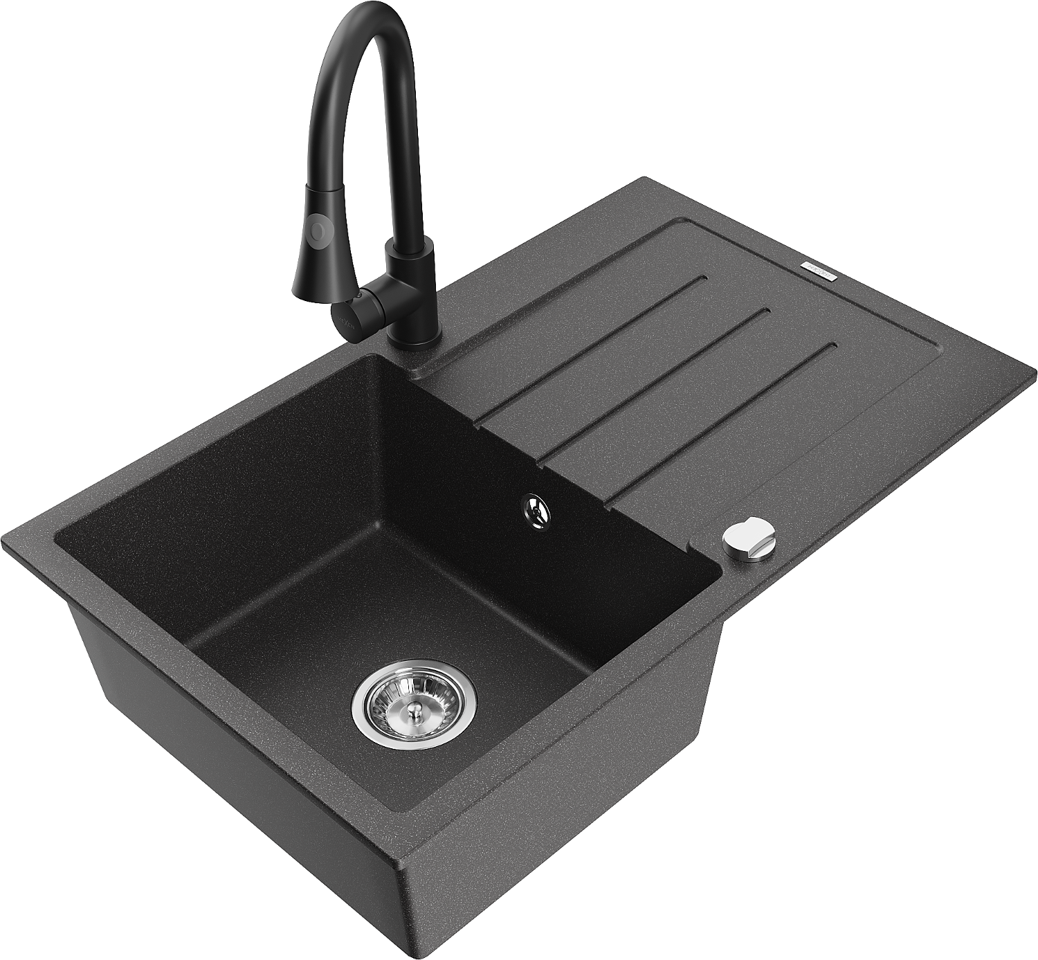 Mexen Bruno jednorázový dřez s odkapávačem a kuchyňskou baterií Elia, černý tečkovaný - 6513-76-670101-70