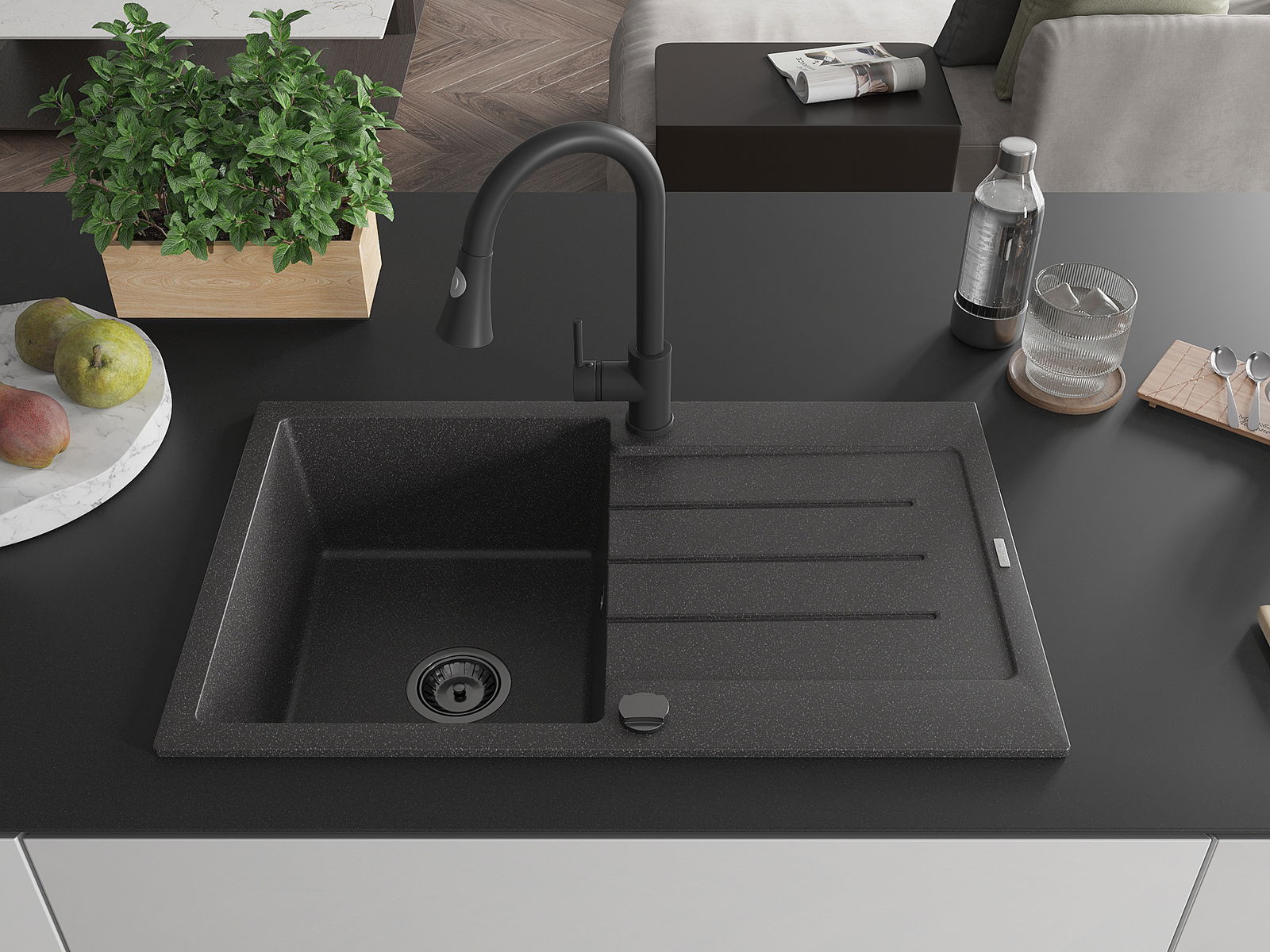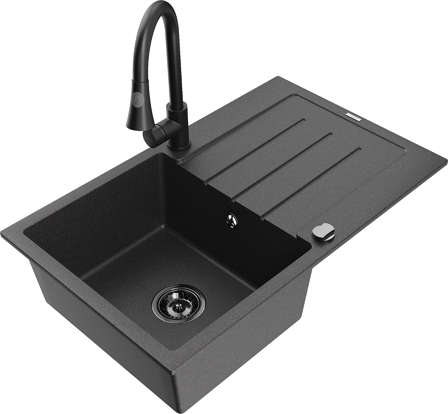 Mexen Bruno granitový dřez 1-komorový s odkapávačem a kuchyňskou baterií Elia, černý kropenatý - 6513-76-670101-70-B