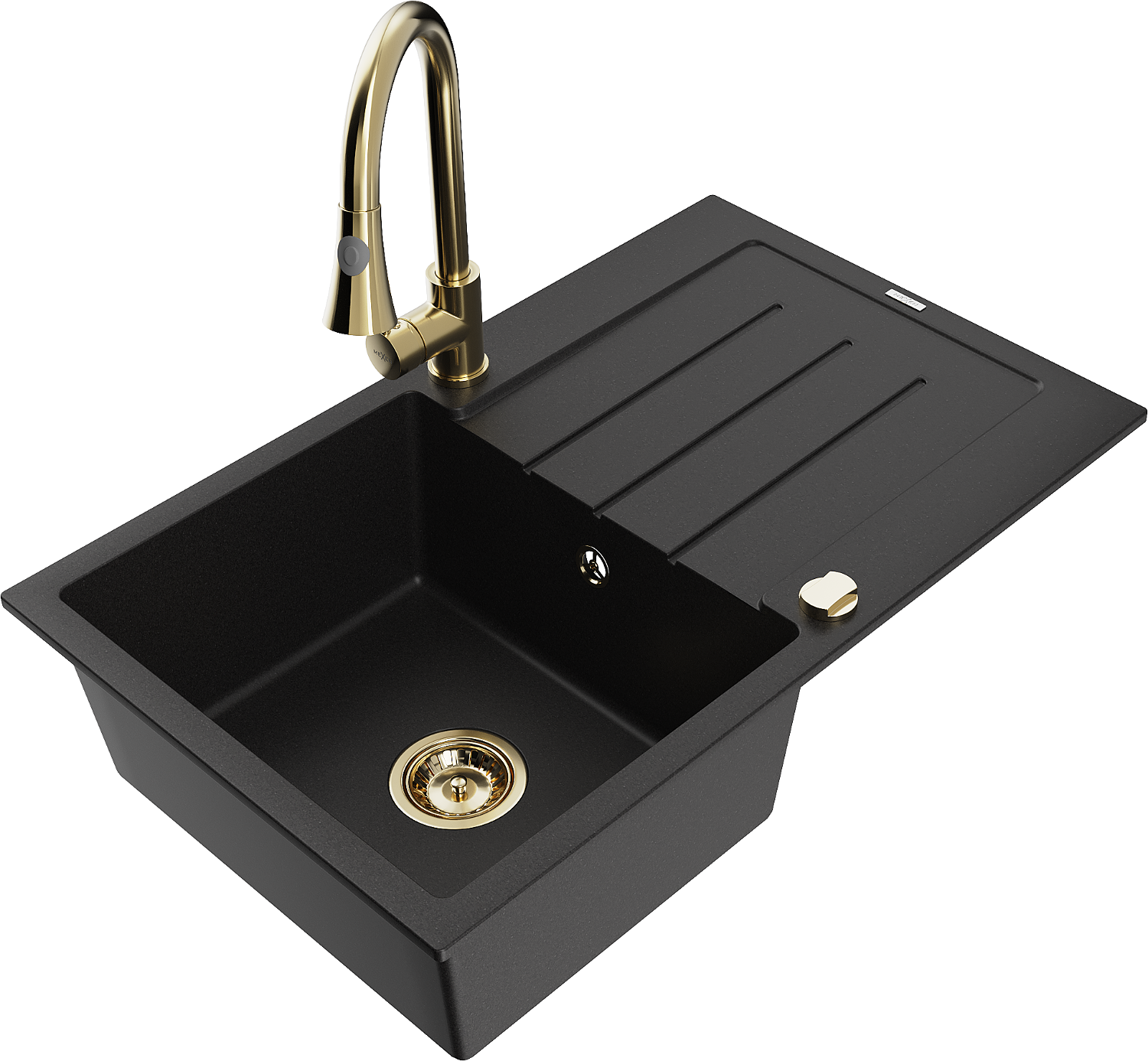 Mexen Bruno granitový dřez 1-komorový s odkapávačem a kuchyňskou baterií Elia, černý - 6513-77-670101-50