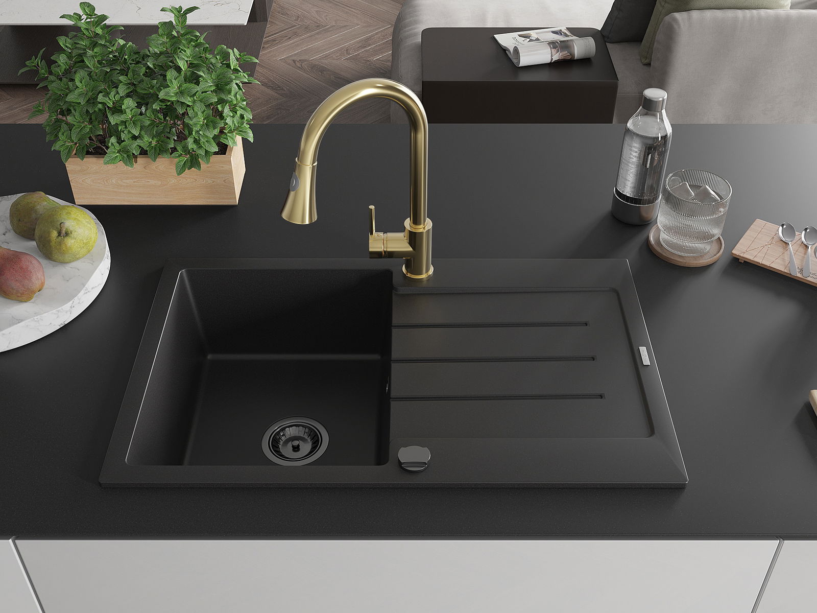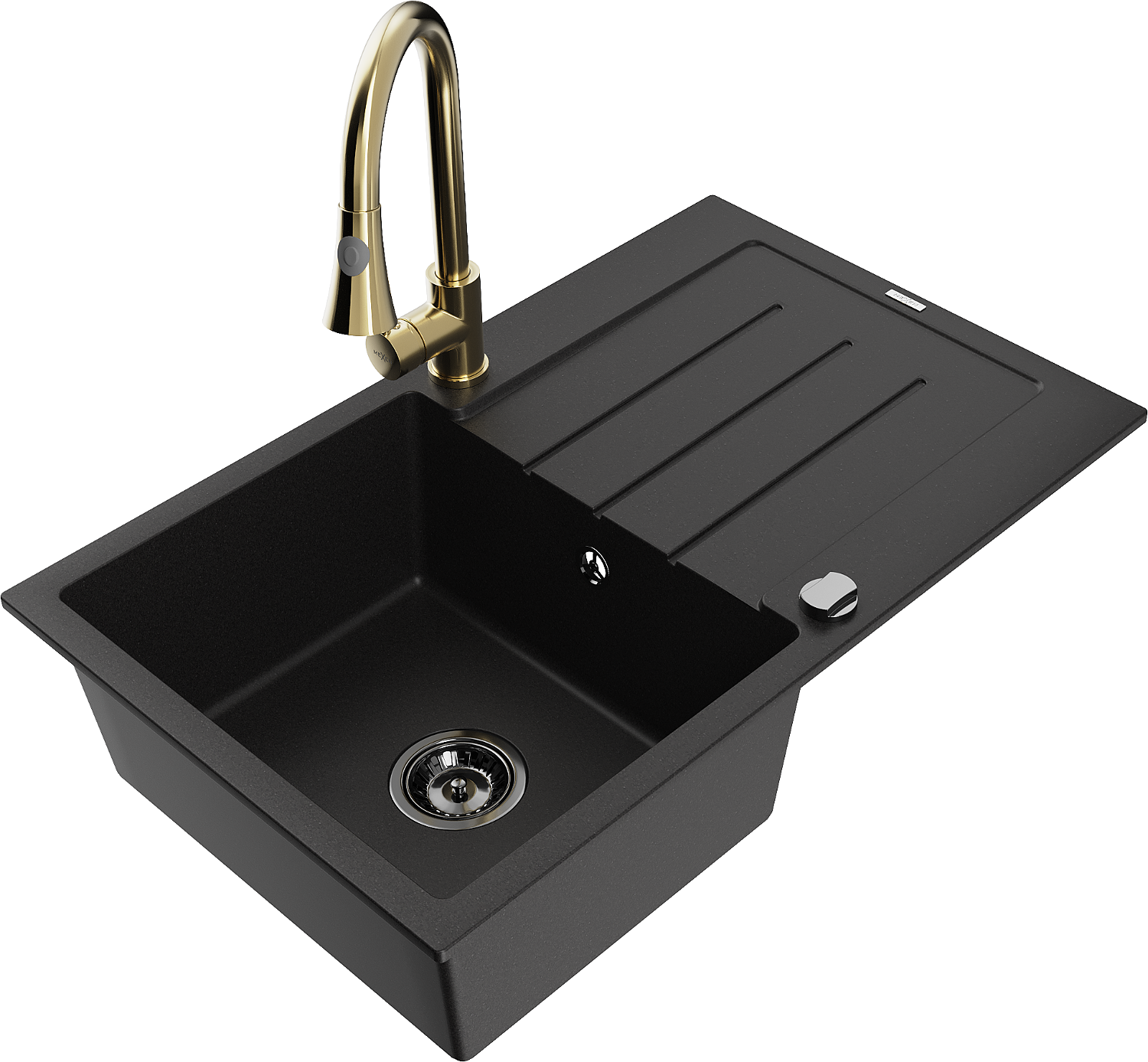 Mexen Bruno žulový dřez 1-komorový s odkapávačem a kuchyňskou baterií Elia, černý - 6513-77-670101-50-B