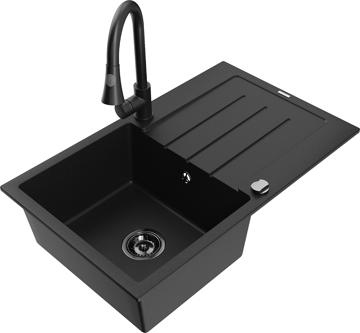Mexen Bruno granitový dřez 1-komorový s odkapávačem a kuchyňskou baterií Elia, černý - 6513-77-670101-70-B