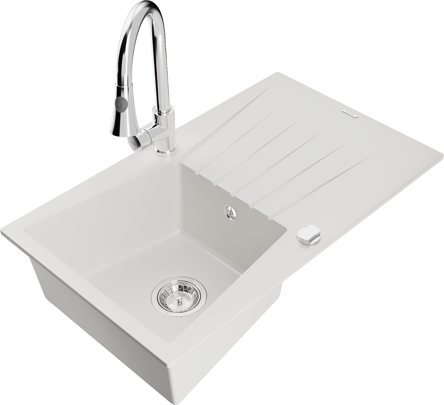 Mexen Cesar granitový dřez s 1 komorou a odkapávačem a kuchyňskou baterií Elia, bílý - 6514-20-670101-00