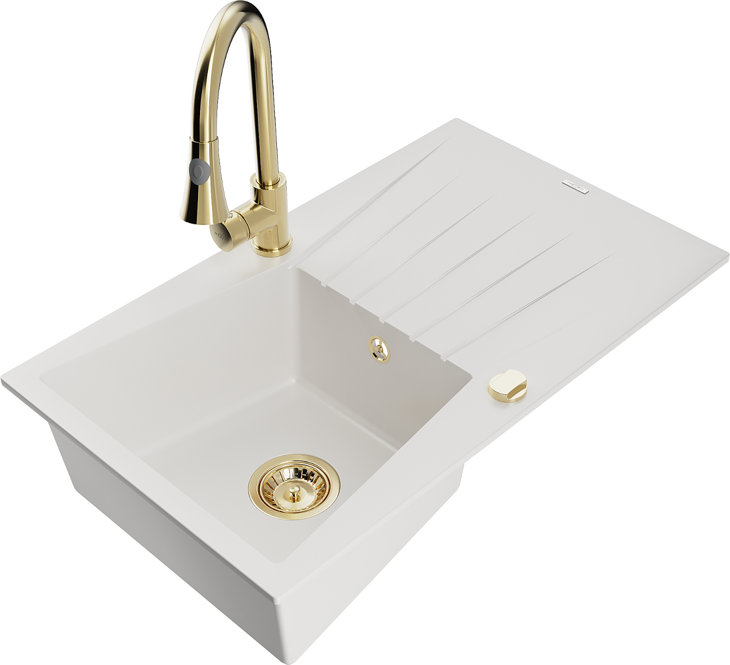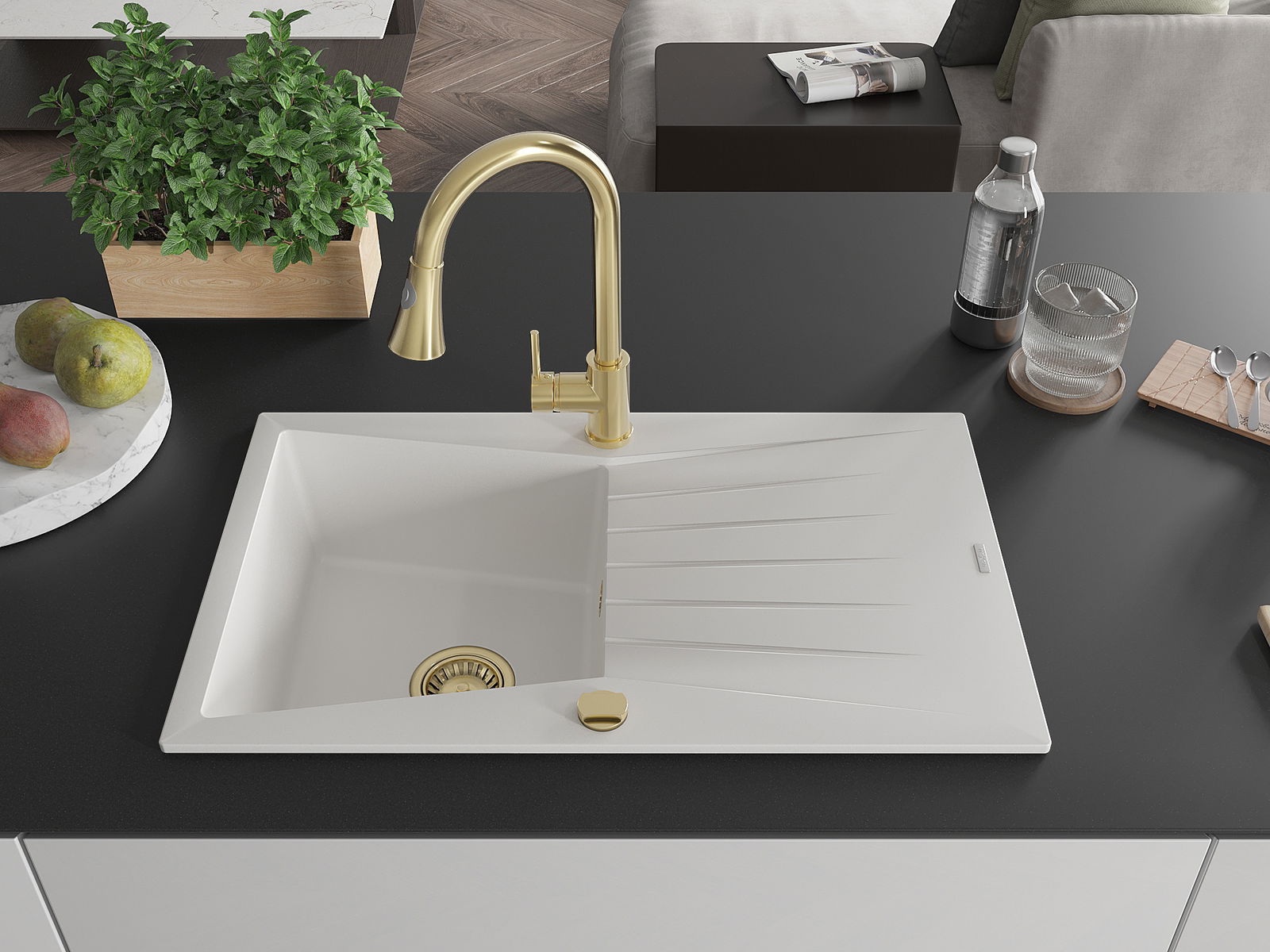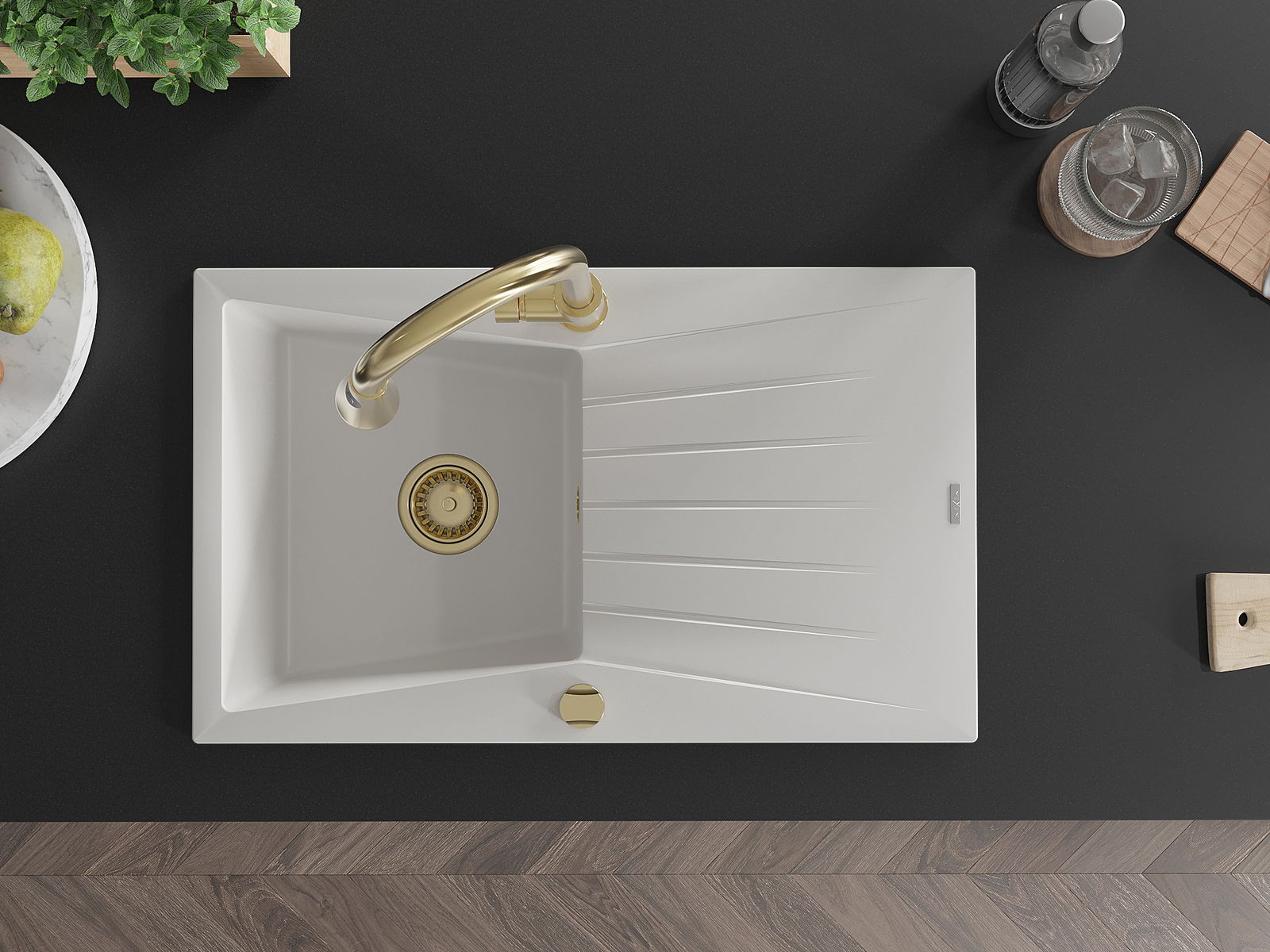 Mexen Cesar granitový dřez s 1 komorou a odkapávačem a kuchyňskou baterií Elia, bílý - 6514-20-670101-50