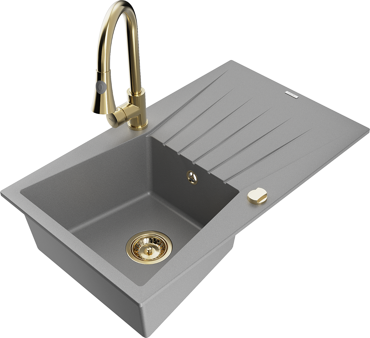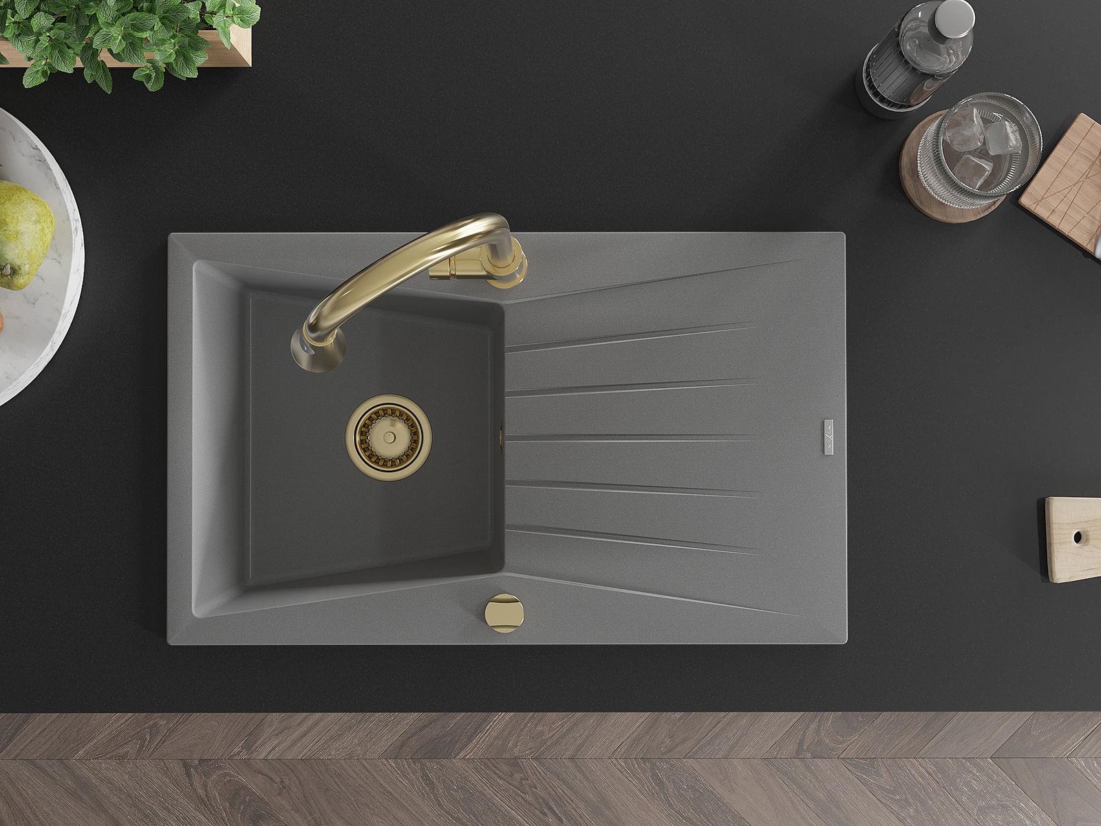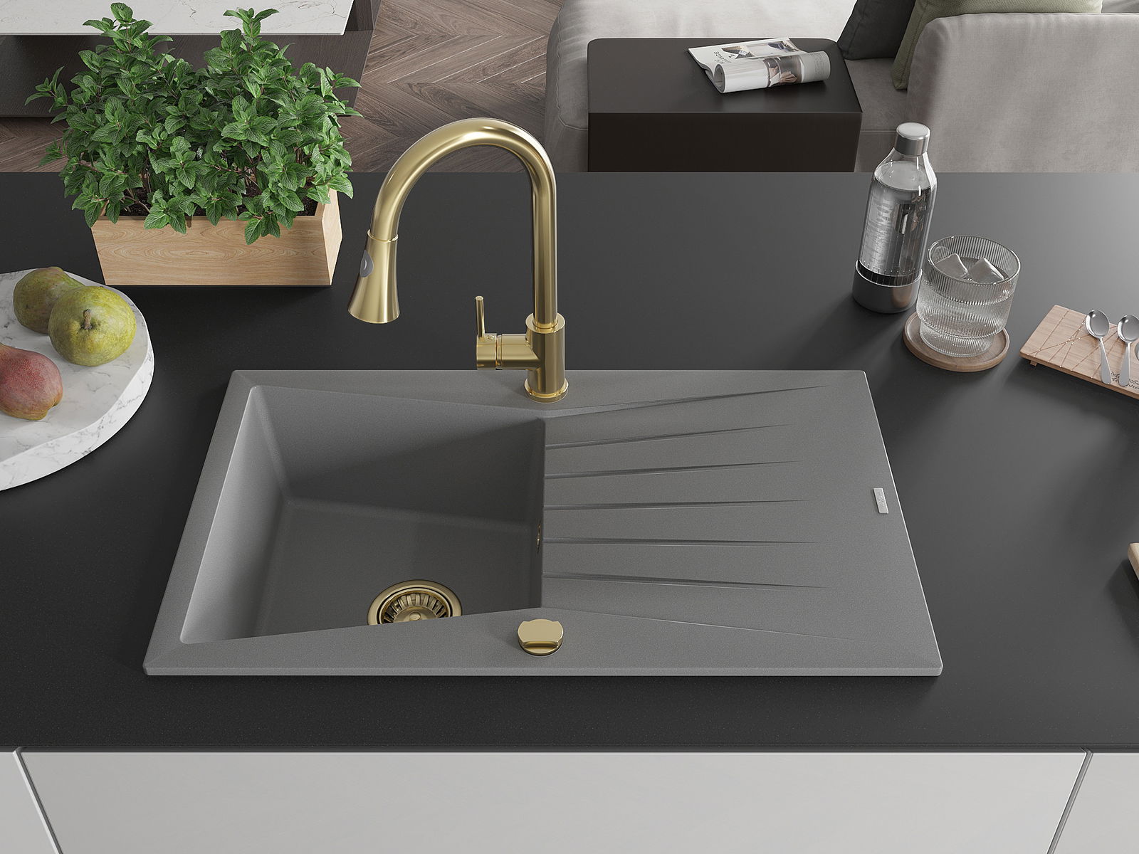Mexen Cesar granitový dřez 1-komorový s odkapávačem a kuchyňskou baterií Elia, šedý - 6514-71-670101-50