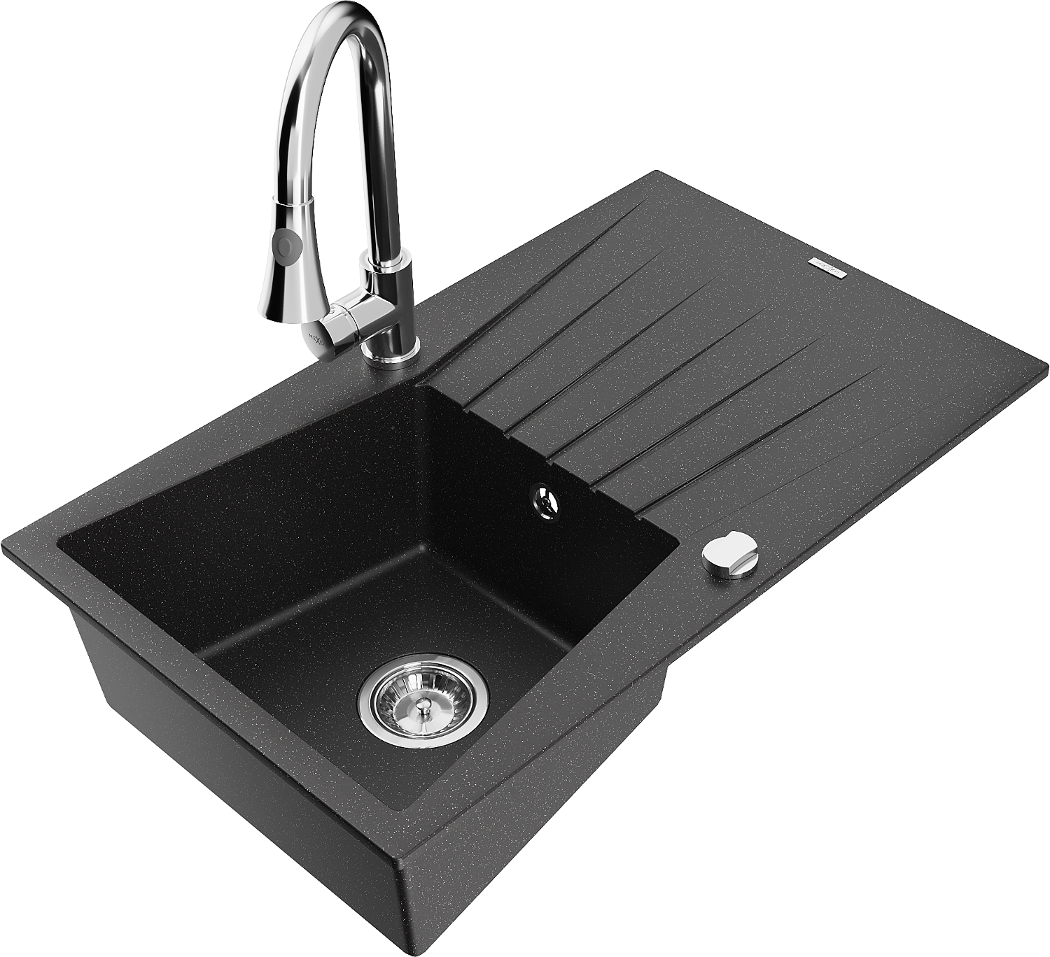 Mexen Cesar granitový dřez s jednou komorou, odkapávačem a kuchyňskou baterií Elia, černý/stříbrný metalík