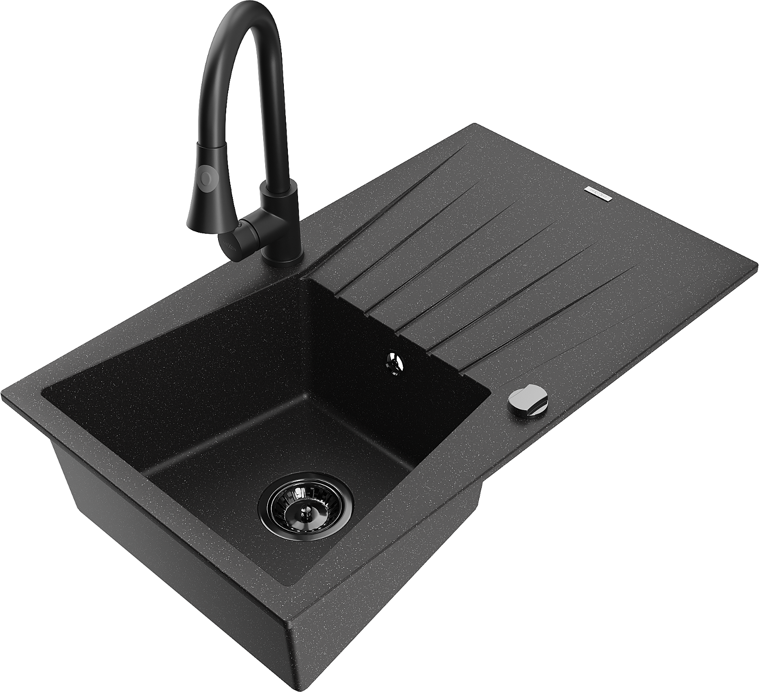 Mexen Cesar jednokomorový granitový dřez s odkapávačem a kuchyňskou baterií Elia, černý/stříbrný metalik - 6514-73-670101-70-B
