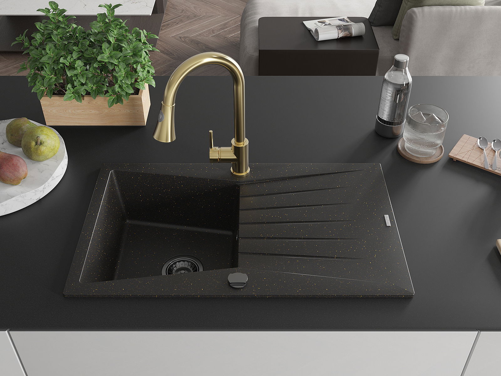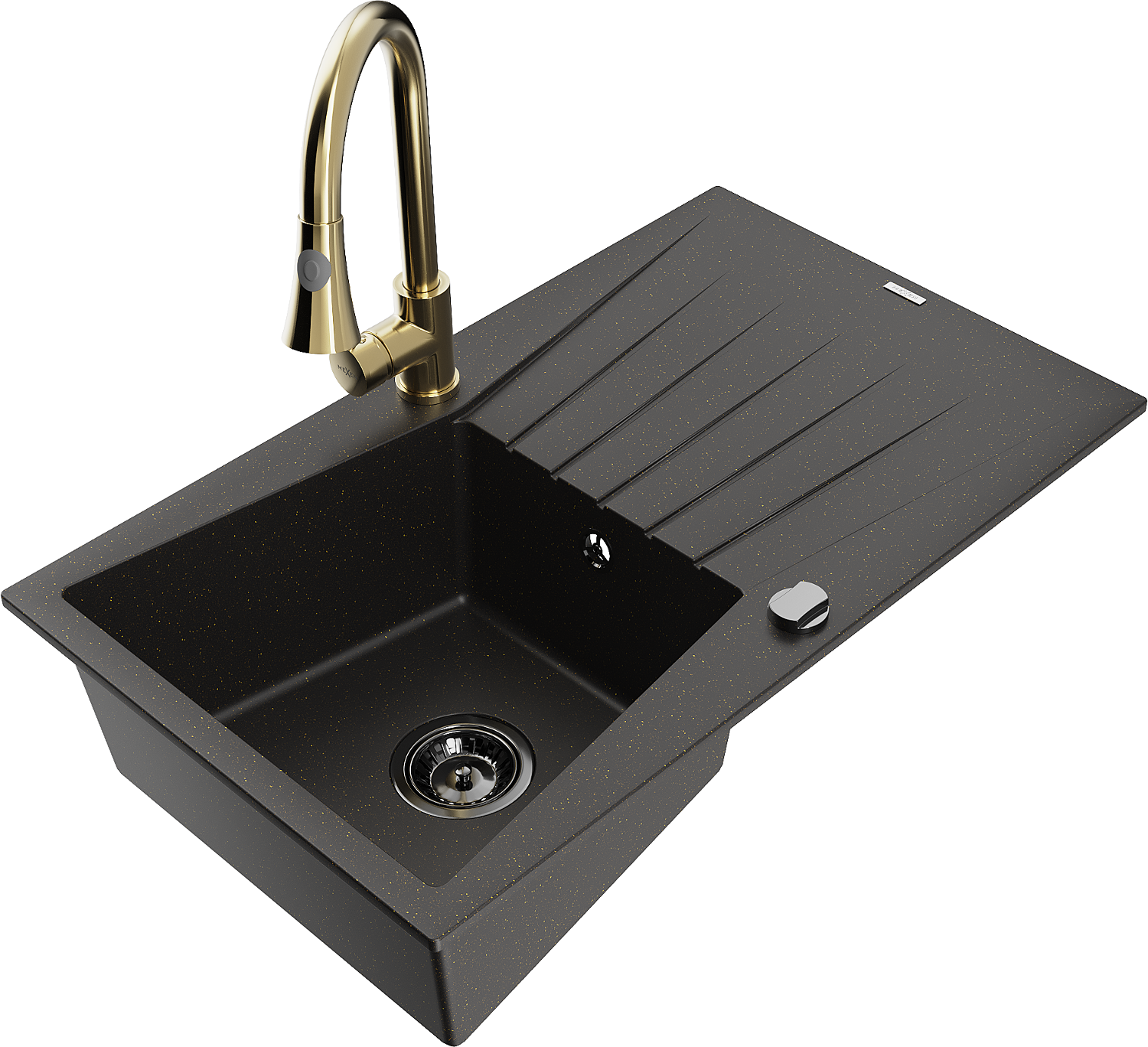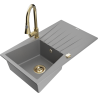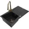 Mexen Cesar granitový dřez s 1 komorou s odkapávačem a kuchyňskou baterií Elia, černý/zlatý metalický - 6514-75-670101-50-B