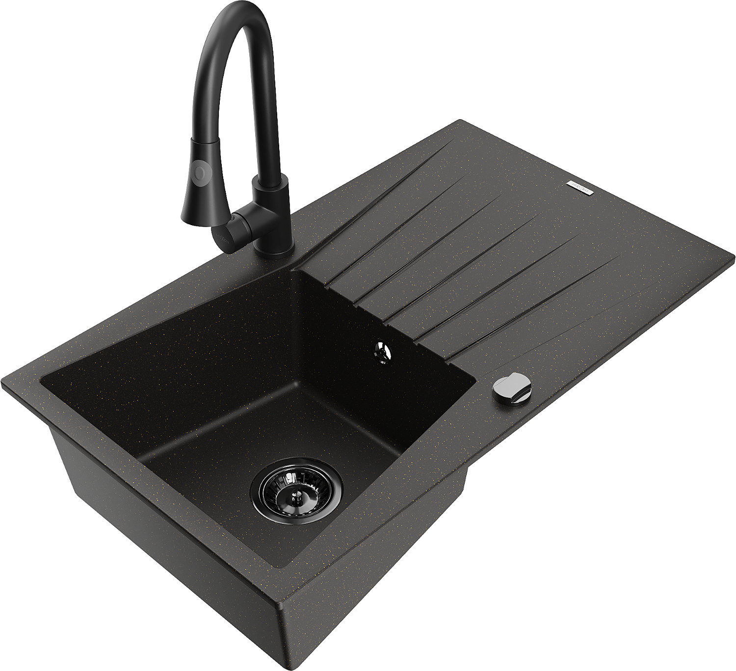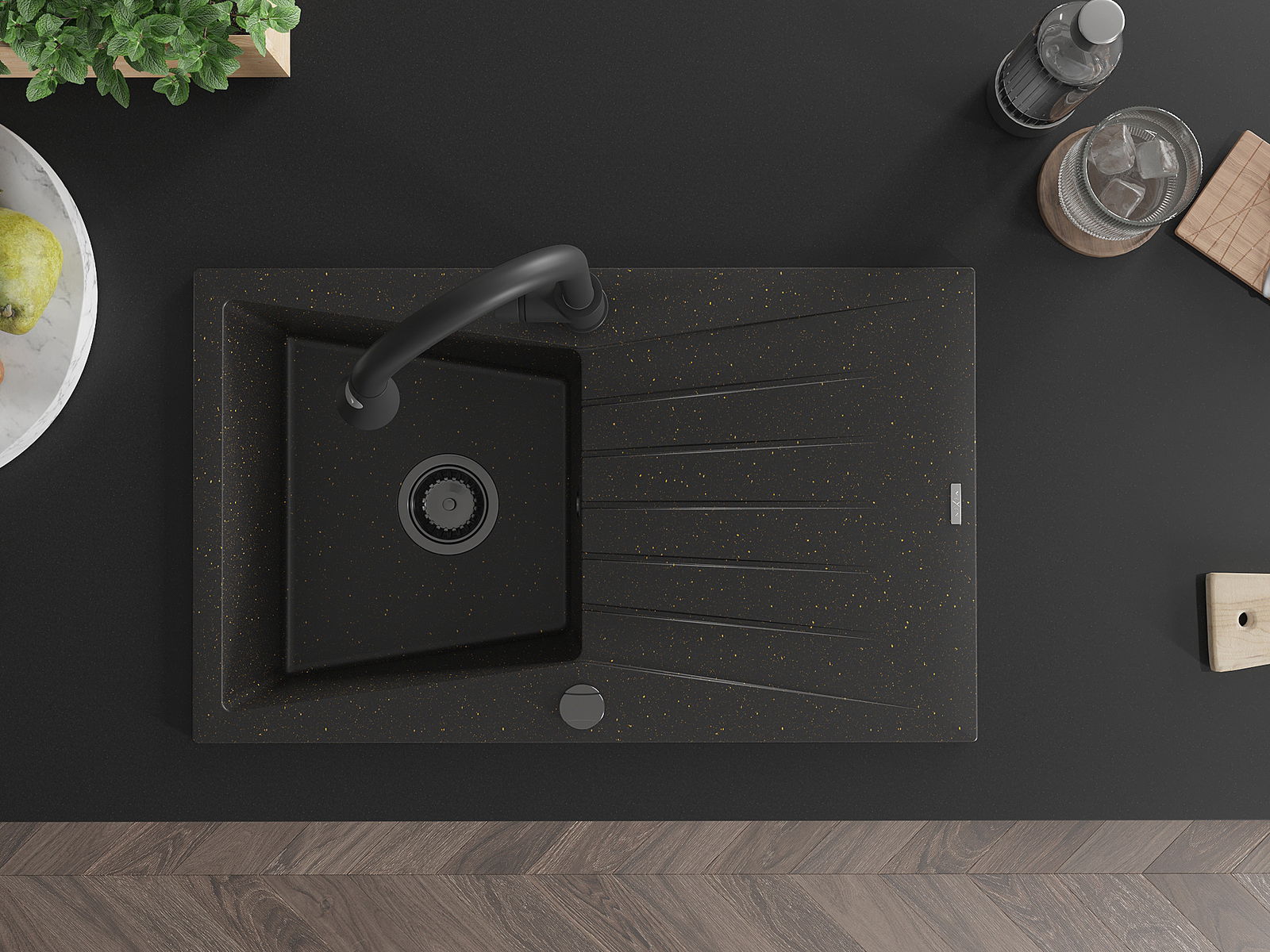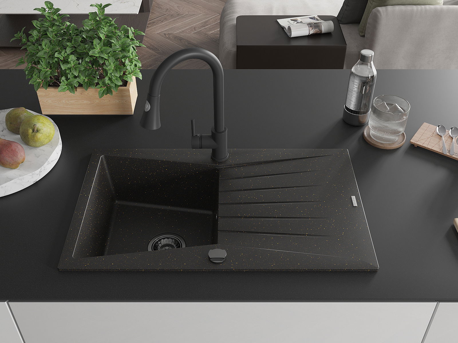 Mexen Cesar žulový dřez s odkapávačem a kuchyňskou baterií Elia, černý/zlatý metalický - 6514-75-670101-70-B
