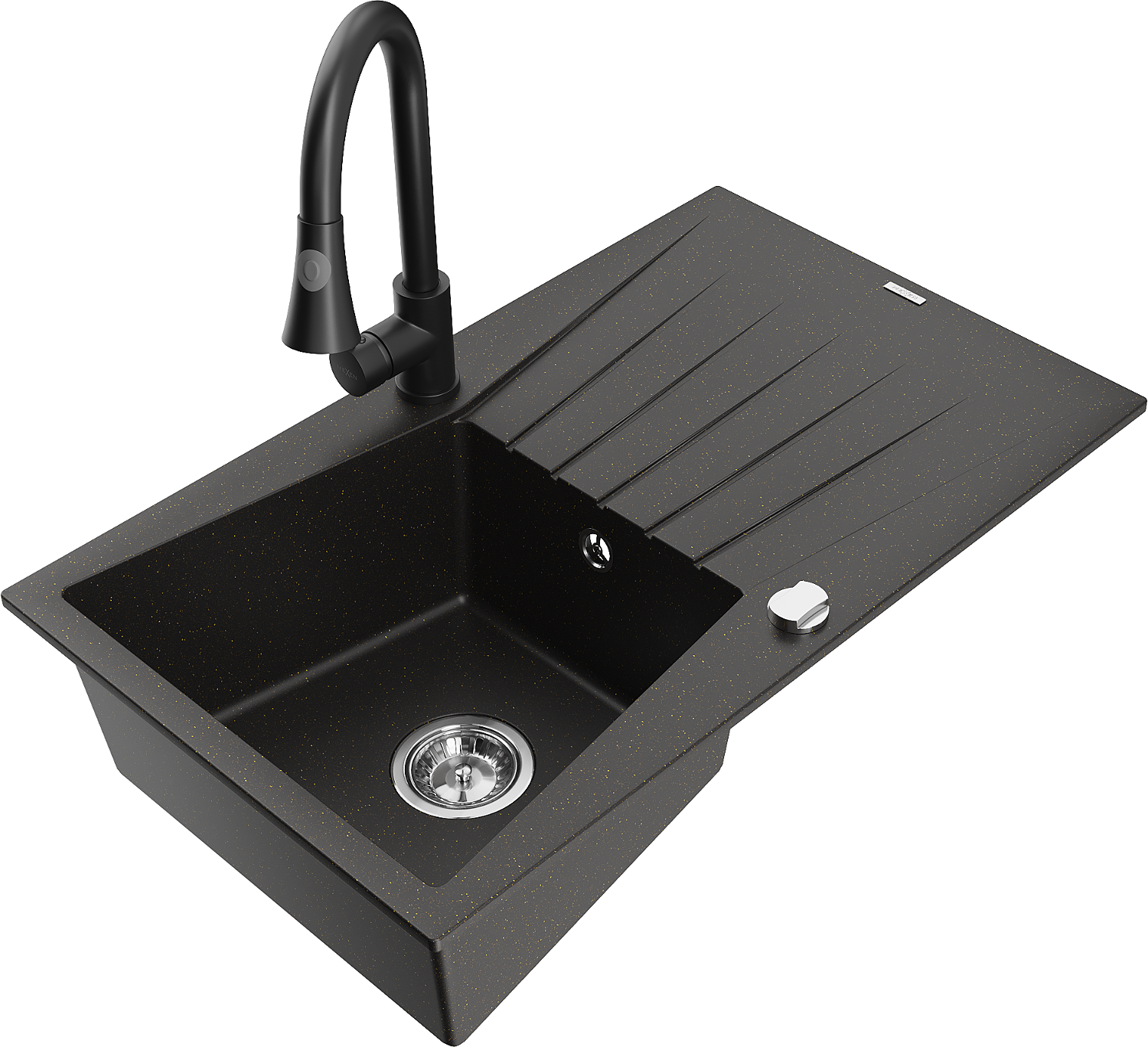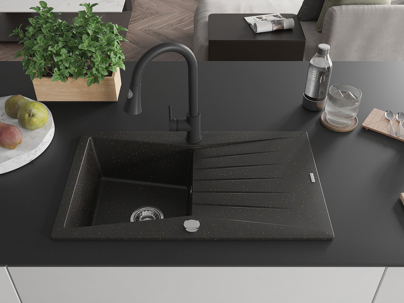 Mexen Cesar žulový dřez s odkapávačem a kuchyňskou baterií Elia, černá/zlatý metalický - 6514-75-670101-70