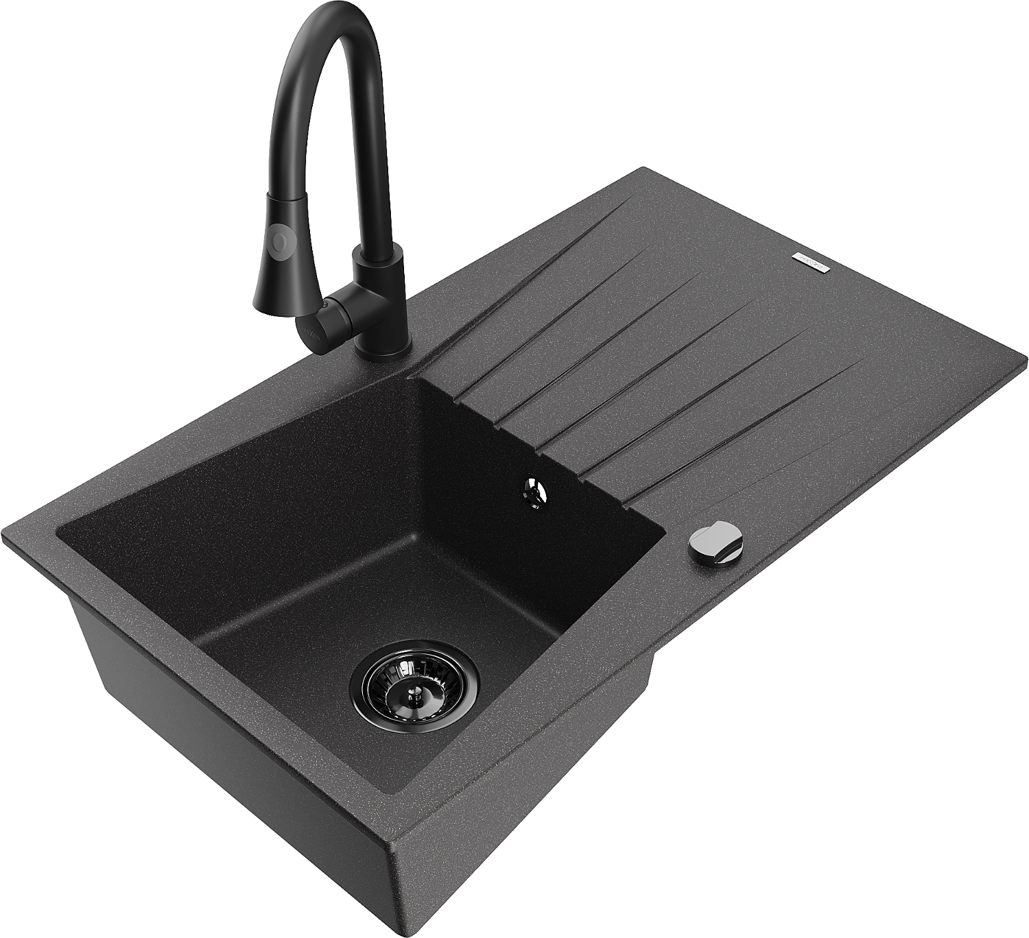 • Mexen Cesar granitový dřez s 1 komorou, odkapávačem a kuchyňskou baterií Elia, černý s žíháním - 6514-76-670101-70-B